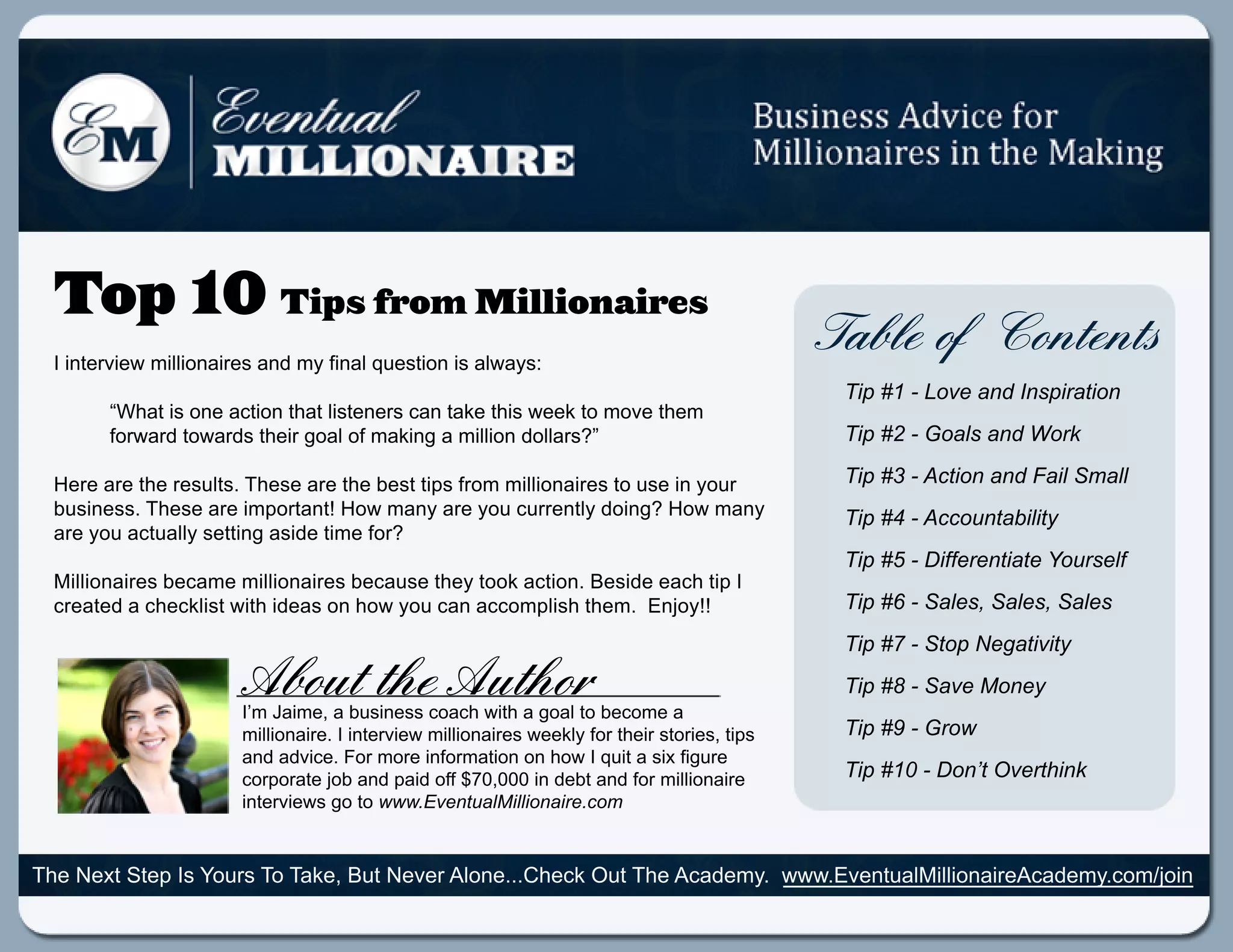 Millionaires became millionaires because they took action. Beside each tip I created a checklist with ideas on how you can accomplish them. Enjoy!!
