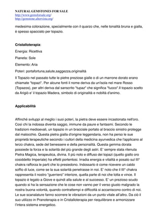 Il topazio è un minerale silicato d'alluminio e fluoro, noto per la sua varietà di colori e utilizzato in gioielleria. Si forma in rocce plutoniche e vulcaniche e ha diverse proprietà terapeutiche associate alla cristalloterapia. Questo minerale, simbolo di nobiltà e salute, viene spesso confuso con altre gemme e richiede attenzione nella sua identificazione e utilizzo.