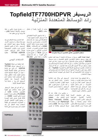 Download this report in :World from the Internet Arabic ﺍﻟﻌﺮﺑﻴﺔ www.TELE-satellite.com/TELE-satellite-0803/ara/topfield.pdf Indonesian Indonesia www.TELE-satellite.com/TELE-satellite-0803/bid/topfield.pdf Bulgarian Български www.TELE-satellite.com/TELE-satellite-0803/bul/topfield.pdf German Deutsch www.TELE-satellite.com/TELE-satellite-0803/deu/topfield.pdf English English www.TELE-satellite.com/TELE-satellite-0803/eng/topfield.pdf Spanish Español www.TELE-satellite.com/TELE-satellite-0803/esp/topfield.pdf Farsi ﻓﺎﺭﺳﻲ www.TELE-satellite.com/TELE-satellite-0803/far/topfield.pdf French Français www.TELE-satellite.com/TELE-satellite-0803/fra/topfield.pdf Greek Ελληνικά www.TELE-satellite.com/TELE-satellite-0803/hel/topfield.pdf Croatian Hrvatski www.TELE-satellite.com/TELE-satellite-0803/hrv/topfield.pdf Italian Italiano www.TELE-satellite.com/TELE-satellite-0803/ita/topfield.pdf Hungarian Magyar www.TELE-satellite.com/TELE-satellite-0803/mag/topfield.pdf Mandarin 中文 www.TELE-satellite.com/TELE-satellite-0803/man/topfield.pdf Dutch Nederlands www.TELE-satellite.com/TELE-satellite-0803/ned/topfield.pdf Polish Polski www.TELE-satellite.com/TELE-satellite-0803/pol/topfield.pdf Portuguese Português www.TELE-satellite.com/TELE-satellite-0803/por/topfield.pdf Russian Русский www.TELE-satellite.com/TELE-satellite-0803/rus/topfield.pdf Swedish Svenska www.TELE-satellite.com/TELE-satellite-0803/sve/topfield.pdf Turkish Türkçe www.TELE-satellite.com/TELE-satellite-0803/tur/topfield.pdf ﺍﻷﻗﻤﺎﺭ ﺍﻟﻤﺘﻌﺪﺩﺓ ، ﻇﻬﺮ ﻟﻨﺎ ﻗﺎﺋﻤﺔ ﻟﻠﻌﻤﻞ ﻣﻊ ﻋﺪﺩ 2 ﺇﺷﺎﺭﺓ ﻟﻸﻗﻤﺎﺭ ﻣﻦ ﺍﻟﻘﻨﻮﺍﺕ ﻓﻰ ﻫﺬﺍ ﺍﻟﺮﻳﺴﻴﻔﺮ ﺍﻟﺼﻨﺎﻋﻴﺔ ﺑﻄﺮﻳﻘﺔ ﻣﻨﻔﺼﻠﺔ ﻭ ﺇﺫﺍ ﻟﻢ ﻣﻤﻠﻮءﺓ ﺑﺎﻟﻘﻨﻮﺍﺕ ﻣﻊ ﺍﻟﺮﻏﻢ ﻣﻦ ﺃﻧﻨﺎ ﻳﻜﻦ ﻟﺪﻳﻚ ﻫﺬﺍ ﺍﻟﻨﻈﺎﻡ ﻳﻤﻜﻦ ﺗﻮﺻﻴﻞ ﻋﺮﺽ ﺍﻟﺼﻮﺭﺓ 3:4 ﻣﻊ ﻭﺟﻮﺩ ﺧﻂ ﺍﻟﺘﻠﻴﻔﺰﻳﻮﻥ ، ﻭ ﻳﺪﻋﻢ ﺍﻟﺮﻳﺴﻴﻔﺮ ﺑﺤﺜﻨﺎ ﻓﻘﻂ ﻋﻠﻰ ﺍﻟﻘﻨﻮﺍﺕ ﺍﻟﻤﺠﺎﻧﻴﺔ ﻭ ﻣﺨﺮﺝ ﺍﻹﺷﺎ ﺭﺍﺕ ﺑﻤﺪﺧﻞ ﺇﺷﺎ ﺭﺍﺕ ﺍﺳﻮﺩ ﻋﻠﻰ ﻳﻤﻴﻦ ﻭ ﻳﺴﺎﺭ ﺍﻟﺼﻮﺭﺓ ﺟﻤﻴﻊ ﻧﺴﻖ ﺍﻟﺼﻮﺭﺓ ,576i, 576p ﻟﻬﺬﺍ ﻗﺮﺭﻧﺎ ﻋﻤﻞ ﺿﺒﻂ ﻟﻬﺬﻩ ﺍﻟﻘﻨﻮﺍﺕ ﺍﻟﺘﻴﻮﻧﺮ ﺍﻟﺜﺎﻧﻲ ﻭ ﻳﺠﺐ ﺃﻥ ﺗﺨﺒﺮ ، ﻭ ﻓﻰ ﻃﺮﻳﻘﺔ ﻋﺮﺽ ﺍﻟﺼﻮﺭﺓ " 720pﻭ 1080iﻭ ﻳﻌﺘﺒﺮ 1080i ﺑﺤﻴﺚ ﻳﻤﻜﻦ ﺿﺒﻂ ﺍﻟﻘﻨﻮﺍﺕ ﺑﻮﺍﺳﻄﺔ ﺍﻟﺮﻳﺴﻴﻔﺮ ﺑﻬﺬﺍ ﻋﻦ ﻃﺮﻳﻖ ﻗﺎﺋﻤﺔ ﺑﻜﺎﻣﻞ ﺍﻟﺸﺎﺷﺔ " ﻳﻜﻮﻥ ﻣﻨﺎﺳﺐ ﻫﻮ ﺍﻷﻓﻀﻞ . ﺇﻋﺎﺩﺓ ﺍﻟﺘﺴﻤﻴﺔ ، ﺍﻟﺘﺤﺮﻳﻚ ، ﺍﻹﻟﻐﺎء ﺍﻟﺘﺮﻛﻴﺐ ﻭ ﻋﻨﺪﻫﺎ ﻳﺘﻢ ﺑﺪﺃ ﻭﻇﻴﻔﺔ ﻟﻠﻌﺮﺽ ﻋﻠﻰ ﺃﺟﻬﺰﺓ ﺍﻟﺘﻠﻴﻔﺰﻳﻮﻥ ﺃﻭ ﺍﻟﺤﺠﺐ ﺑﻮﺍﺳﻄﺔ ﺇﺩﺧﺎﻝ ﻛﻮﺩ ﻟﻤﻨﻊ ﺍﻟﺘﺴﺠﻴﻞ . ، plasma TVﺣﻴﺚ ﻳﺘﻢ ﺗﺠﻨﺐ ﺃﻥ ﺇﻥ ﺍﻟﺮﻳﺴﻴﻔﺮ ﻣﺠﻬﺰ ﻟﻼﺳﺘﺨﺪﺍﻡ ﺍﻷﻃﻔﺎﻝ ﻣﻦ ﻣﺸﺎﻫﺪﺓ ﺑﻌﺾ ﺍﻟﻘﻨﻮﺍﺕ ﺗﺤﺪﺙ ﺍﻟﺨﻄﻮﻁ ﺍﻟﺴﻮﺩﺍء ﻋﻠﻰ ﺟﺎﻧﻴﺔ ﻓﻰ ﺟﻤﻴﻊ ﺃﻧﺤﺎء ﺍﻟﻌﺎﻟﻢ ﻭ ﻟﻬﺬﺍ ﻳﻮﺟﺪ ﺍﻟﻐﻴﺮ ﻣﻨﺎﺳﺒﺔ ، ﻭ ﻳﻤﻜﻦ ﻧﻘﻞ ﺍﻟﻘﻨﻮﺍﺕ ﻭ ﻟﻘﺪ ﺃﺩﻫﺸﺘﻨﺎ ﺳﺮﻋﺔ ﺍﻟﺒﺤﺚ ﻋﻦ ﺍﻟﺼﻮﺭﺓ ﺇﻟﻰ ﺗﻠﻒ ﻫﺬﻩ ﺍﻟﻨﻮﻋﻴﺔ ﻣﻦ ﺍﻟﻌﺪﻳﺪ ﻣﻦ ﻟﻐﺎﺕ ﺗﺸﻐﻴﻞ ﺍﻟﻘﻮﺍﺋﻢ ﺍﻟﻤﺤﺒﺒﺔ ﻟﺪﻳﻚ ﺩﺍﺧﻞ ﺇﺣﺪﻯ ﺍﻟﻘﻮﺍﺋﻢ ﺍﻟﻘﻨﻮﺍﺕ : ﻓﻘﻂ ﺧﻤﺲ ﺩﻗﺎﺋﻖ ﺍﺣﺘﺎﺟﻬﺎ ﺍﻟﺸﺎﺷﺎﺕ . : ﺣﻴﺚ ﻳﻮﺟﺪ ﺍﻟﻠﻐﺔ ﺍﻷﻟﻤﺎﻧﻴﺔ ، ﺍﻟﻤﻨﻔﺼﻠﺔ ﺍﻟﺘﻲ ﻳﻤﻜﻦ ﺗﺴﻤﻴﺘﻬﺎ ﻃﺒﻘﺎ ﺍﻟﺮﻳﺴﻴﻔﺮ ﻟﻠﺒﺤﺚ ﻓﻰ ﻋﺪﺩ 08 ﻧﺎﻗﻞ ﺍﻹﻧﺠﻠﻴﺰﻳﺔ ، ﺍﻟﻔﺮﻧﺴﻴﺔ ، ﺍﻹﻳﻄﺎﻟﻴﺔ ﻟﻠﻤﺴﺘﺨﺪﻡ ﻭ ﺫﻟﻚ ﻟﺴﻬﻮﻟﺔ ﺍﺳﺘﺪﻋﺎء ﻟﻠﺒﺎﻗﺎﺕ ﻭ ﻟﻘﺪ ﻛﻨﺎ ﺳﻌﺪﺍء ﺣﻴﺚ ﺃﻥ ﻭ ﺑﻌﺪ ﺇﺗﻤﺎﻡ ﻋﻤﻠﻴﺔ ﺍﻟﻀﺒﻂ ﺍﻷﻭﻟﻲ ، ﺍﻷﺳﺒﺎﻧﻴﺔ ، ﺍﻟﺘﺮﻛﻴﺔ ، ﺍﻟﺪﺍﻧﻤﺮﻛﻴﺔ ﺍﻟﻘﻨﻮﺍﺕ ﺍﻟﻤﻔﻀﻠﺔ ﻟﺪﻳﻚ ﻓﻰ ﻭﻗﺖ ﺑﻴﺎﻧﺎﺕ ﺍﻟﻨﻮﺍﻗﻞ ﻛﺎﻧﺖ ﺣﺪﻳﺜﺔ ﺟﺪﺍ ﻟﻠﺮﻳﺴﻴﻔﺮ ﺗﺼﺒﺢ ﺍﻟﺨﻄﻮﺓ ﺍﻟﺘﺎﻟﻴﺔ ، ﺍﻟﺴﻮﻳﺪﻳﺔ ، ﺍﻟﻨﺮﻭﻳﺠﻴﺔ ، ﺍﻟﻬﻮﻟﻨﺪﻳﺔ ﻻﺣﻖ . ﻣﻊ ﺗﻔﻌﻴﻞ ﺍﺳﺘﻘﺒﺎﻝ ﺍﻟﻘﻨﻮﺍﺕ ﺍﻟﻔﺎﺋﻘﺔ ﻫﻼ ﺿﺒﻂ ﺍﻟﺮﻳﺴﻴﻔﺮ ﻟﻠﻌﻤﻞ ﻣﻊ ، ﺍﻟﺒﻮﻟﻨﺪﻳﺔ ، ﺍﻟﻔﻨﻠﻨﺪﻳﺔ ﻭ ﺍﻟﻤﺠﺮﻳﺔ ، ﺍﻟﺘﻔﺎﺻﻴﻞ HDTVﺑﻨﻈﺎﻡ -DVB ﺍﻷﺟﻬﺰﺓ ﺍﻷﺧﺮﻯ ، ﺇﻥ ﻫﺬﺍ ﺍﻟﺮﻳﺴﻴﻔﺮ ﻭ ﻫﻨﺎﻙ ﺃﻳﻀﺎ ﻗﺎﺋﻤﺔ ﺿﺒﻂ ﻻﺧﺘﻴﺎﺭ ﻭ ﻟﻤﻦ ﻳﻬﻮﻯ ﻋﻤﻠﻴﺔ ﺗﺮﺗﻴﺐ 2 Sﺃﺛﻨﺎء ﻋﻤﻠﻴﺔ ﺍﻟﺒﺤﺚ . ﻗﺎﺩﺭ ﻋﻠﻰ ﺍﺳﺘﻘﺒﺎﻝ ﺍﻹﺭﺳﺎﻝ ﺍﻟﺮﻗﻤﻲ ﻧﻈﺎﻡ ﺍﻹﺭﺳﺎﻝ ﺍﻟﻤﻠﻮﻥ ﻟﻠﻌﻤﻞ ﻣﻊ ﺍﻟﻘﻨﻮﺍﺕ ﻭ ﻻ ﻳﺮﻳﺪ ﺿﺒﻂ ﺍﻟﻘﻨﻮﺍﺕ ﺍﻟﻌﺎﺩﻱ DVB-Sﻭ ﺍﻟﺠﺪﻳﺪ -DVB ﻣﺨﺎﺭﺝ ﺳﻜﺎﺭ