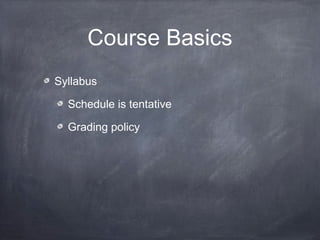 - It outlines the topics to be covered in the course, including the basics of the syllabus, required readings from a textbook and Wall Street Journal, and use of an online learning platform.