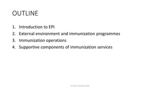 The document discusses the Expanded Programme on Immunization (EPI), which aims to eradicate and eliminate vaccine-preventable diseases through vaccination programs. It describes the goals and components of EPI, including vaccines, cold chain storage, service delivery, disease surveillance, and social mobilization. The key operations of immunization systems are outlined as vaccine supply and quality, logistics, service delivery, surveillance, and communication. Supporting components that sustain immunization operations are management, sustainable financing, and strengthening human and institutional resources.