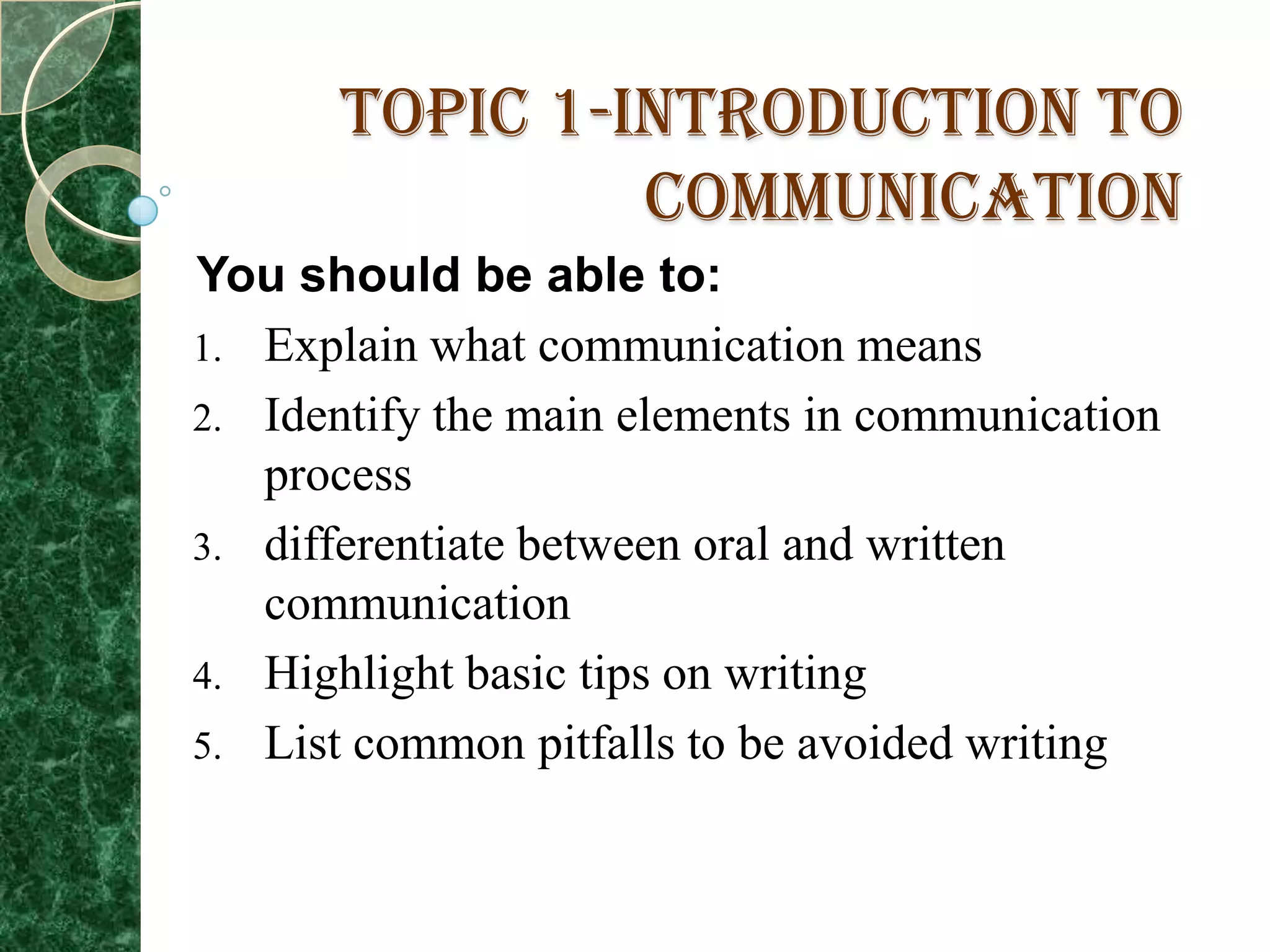This document provides an introduction to communication, including definitions, elements, and differences between oral and written communication. It discusses the communication process, factors that can affect communication, and tips for effective written communication. Specifically, it defines communication as the exchange of information between parties to ensure complete understanding. The main elements are identified as the sender, message, channel, receiver, feedback, and context. Oral communication involves spoken language while written relies on written symbols. Tips for improving writing include reading, note-taking, and listening, as well as ensuring proper grammar, vocabulary, and organization.