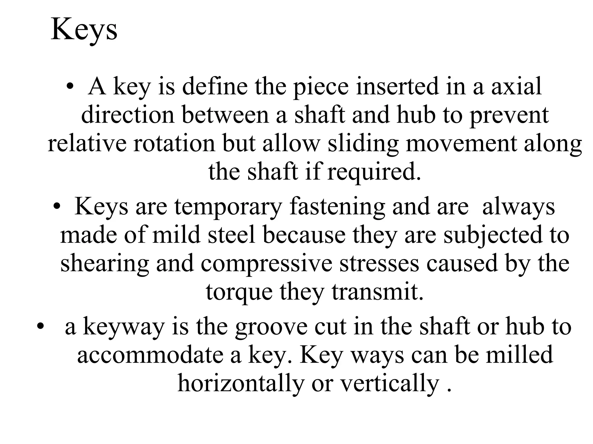 A key is used to prevent relative rotation between a shaft and hub while allowing sliding movement. Keys are made of mild steel and subjected to shearing and compressive stresses. There are several types of keys including saddle keys, sunk keys, feather keys, Woodruff keys, and round keys. Saddle keys rely only on friction while sunk keys provide a positive drive through being sunk into both the shaft and hub. Spline and serrated shafts are alternatives that divide the transmitted power over multiple keys or teeth for increased strength.
