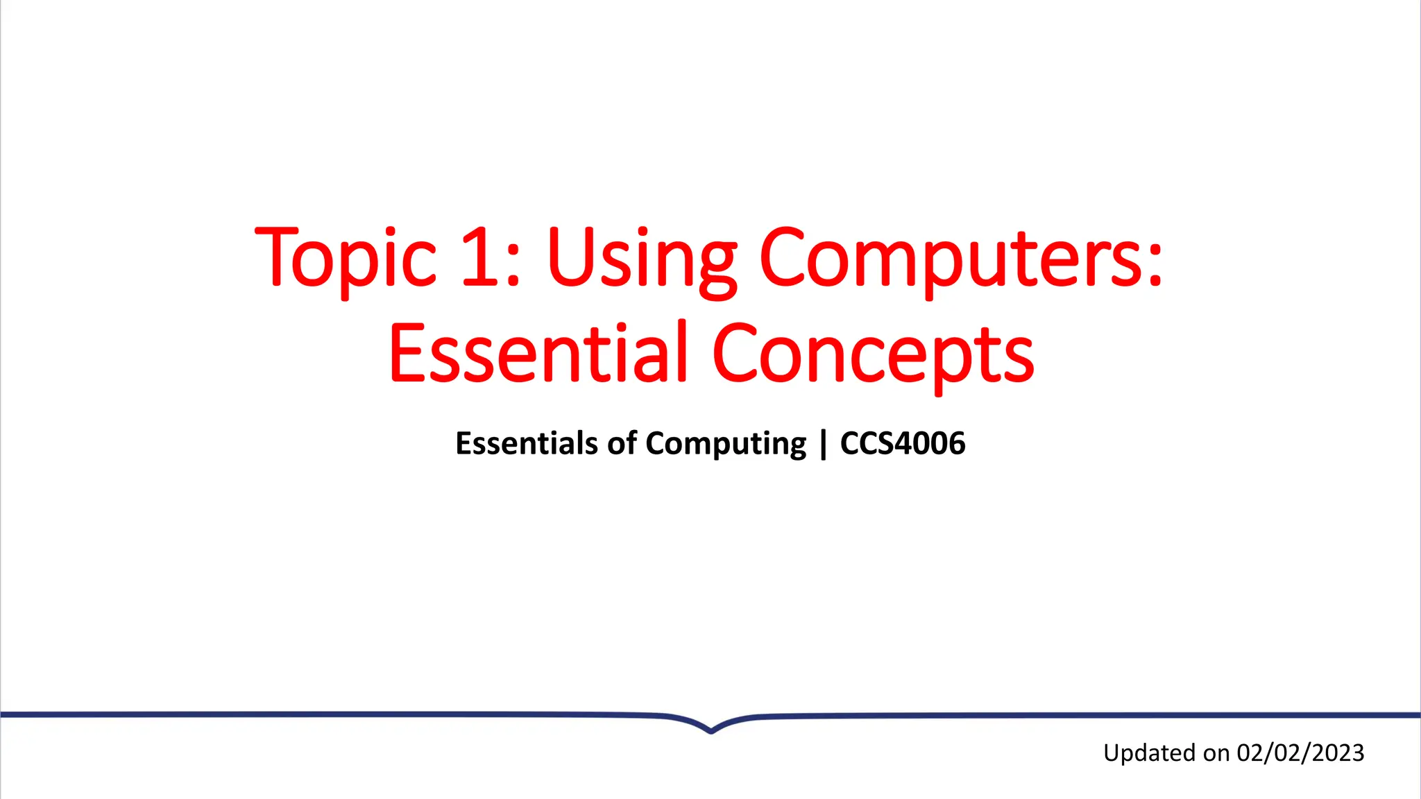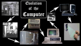 This document provides an overview of essential concepts related to using computers. It discusses the definition of a computer, its main functions of accepting data as input, processing that data, and producing and storing output. The document then covers the evolution of computers through five generations from the earliest vacuum tube computers to today's fifth-generation machines capable of artificial intelligence. It also defines different types of computers like supercomputers, mainframes, minicomputers, and microcomputers. Finally, the key components of a computer system including input, processing, storage, and output devices are outlined.