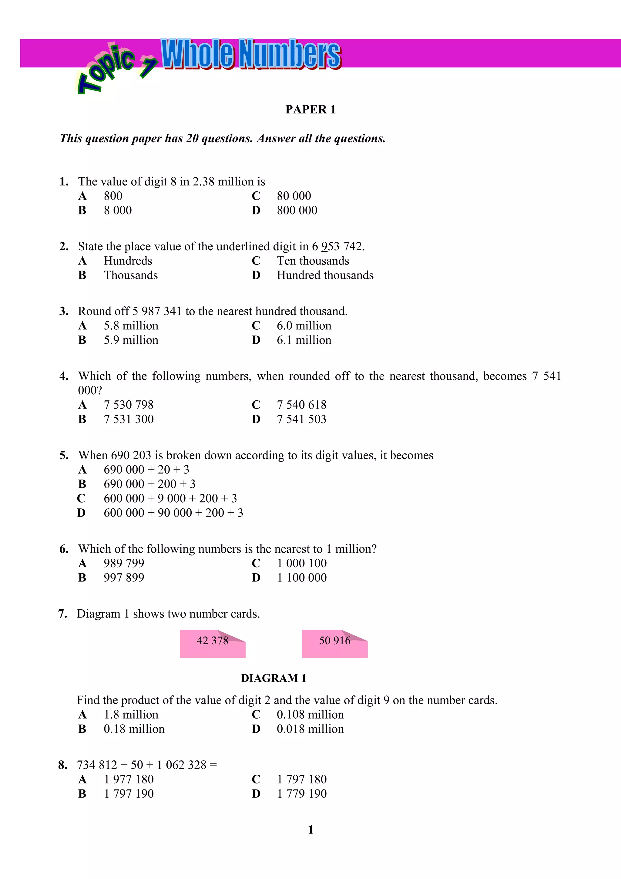 This document contains two sample question papers with math word problems. Paper 1 contains 20 questions testing skills like place value, rounding, addition, subtraction, multiplication, division, and interpreting data in tables and diagrams. Paper 2 contains 10 additional questions on similar math concepts. The questions involve operations on large numbers, word problems, and interpreting data in tables.