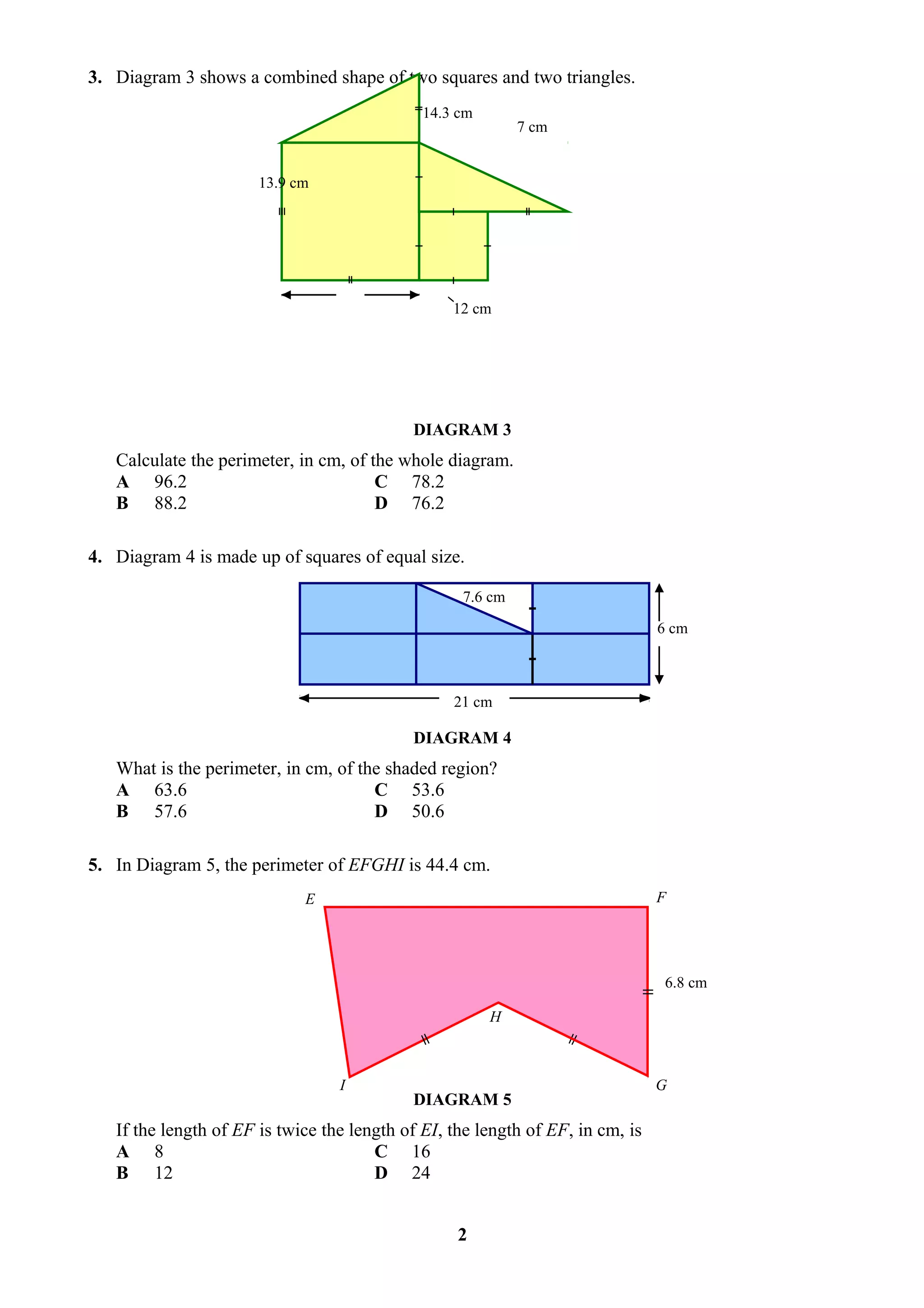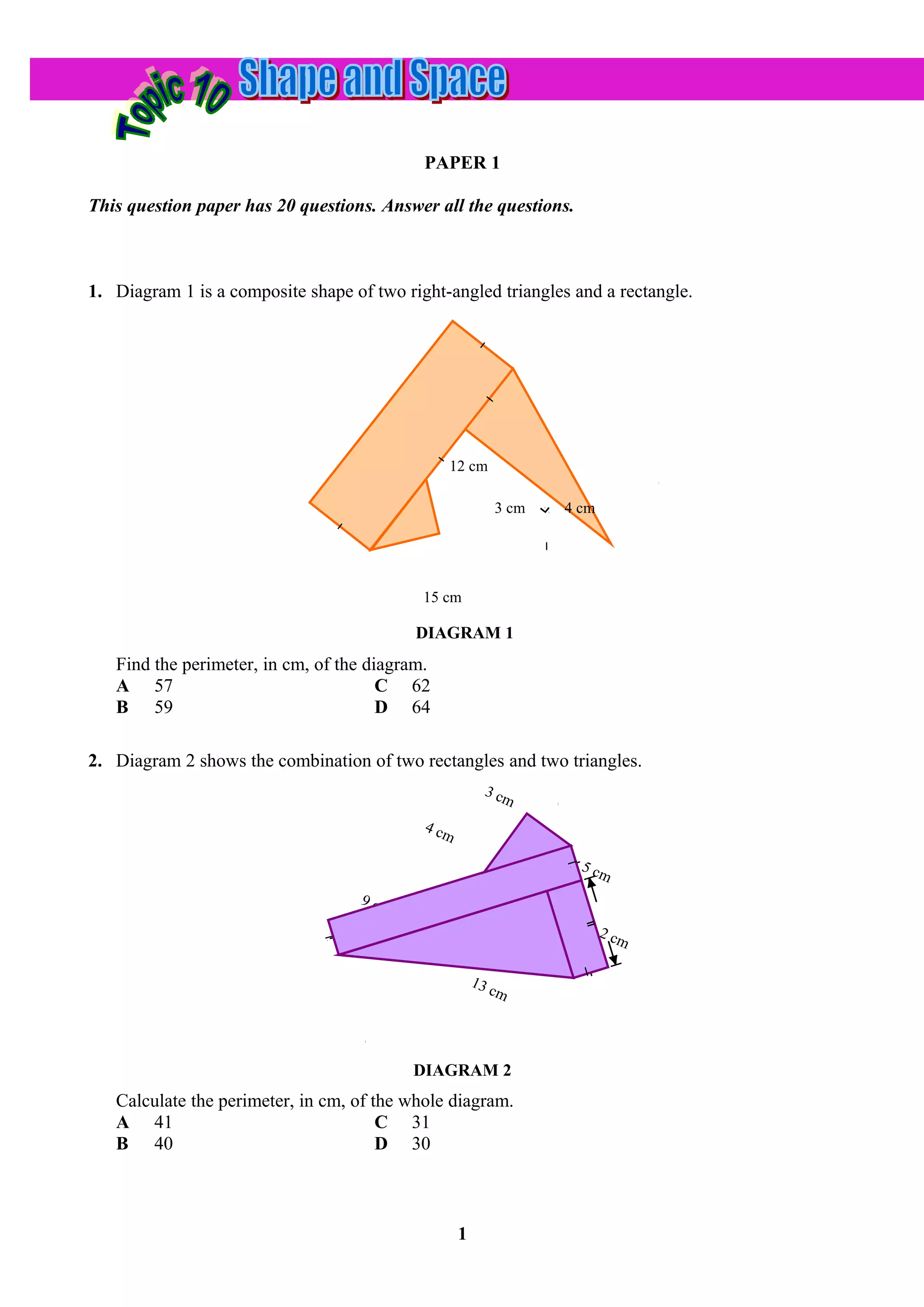 This document contains two question papers with multiple choice and short answer questions about calculating perimeters, areas, volumes, and surface areas of 2D and 3D shapes made up of combinations of basic geometric shapes. The questions involve diagrams of composite shapes and solids and require applying formulas to find values like perimeters, areas, volumes, lengths and prices. Some questions provide additional information like measurements or part of the calculation to solve for the missing value.