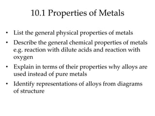 This document outlines the syllabus statements for Cambridge IGCSE Chemistry regarding metals. It covers 10 topics: the properties of metals, reactivity series, extracting metals like iron and aluminum, and the uses of common metals such as aluminum, copper, zinc, steel, and stainless steel. Students are expected to understand the physical and chemical properties of metals, how the reactivity series relates to a metal's ability to form ions and react, extraction methods and reactions, and the relationship between a metal's properties and its common applications.