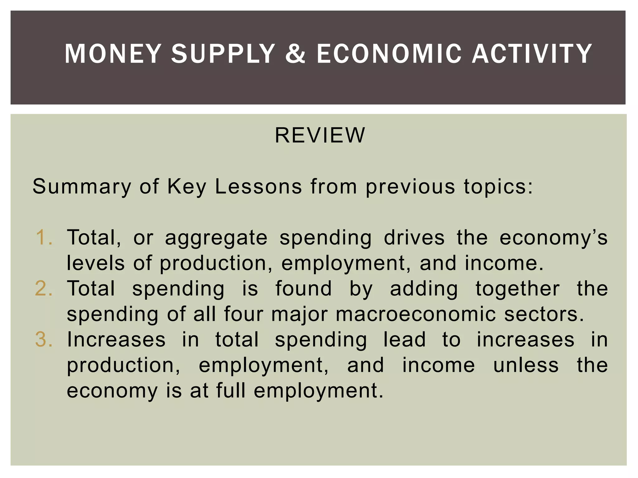 1) How changes in money supply can affect total output and price levels in the economy. An increase in money supply when the economy is not at full employment will lead to increases in output more than prices, while at full employment it will lead to price increases more than output.