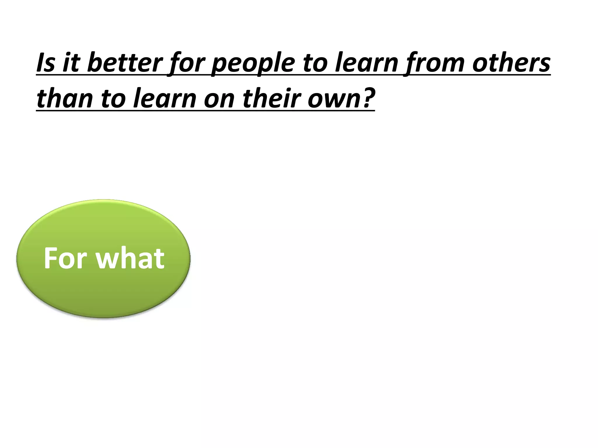 The document discusses whether it is better for people to learn from others or learn on their own. It explores this question in relation to learning about the physical world, inner world, subjects, personal image, and big decisions in life. The document presents both sides of the debate and considers the pros and cons of learning from others versus learning independently.