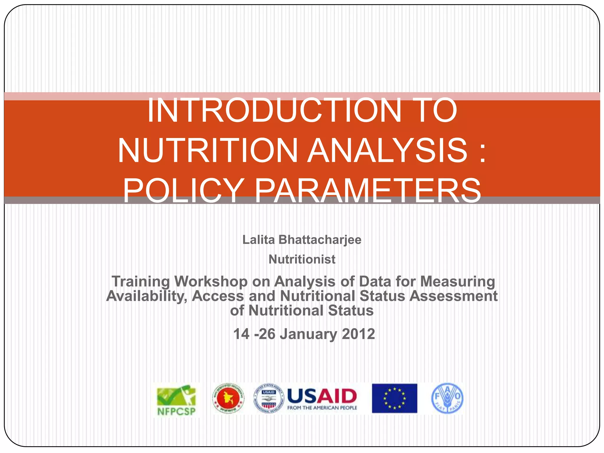 This document discusses key concepts and methods for conducting dietary assessments and nutritional analysis. It defines dietary assessment, nutritional assessment, nutritional status, nutrient intake and requirements. It also discusses optimal nutritional status, dietary assessment principles, dietary diversity, and when to measure dietary diversity. Different food groups are identified for constructing the Household Dietary Diversity Score and Women's Dietary Diversity Score. Methods for calculating and setting thresholds for these scores are described. The document also illustrates the association between dietary adequacy and anthropometric measures of nutritional status.