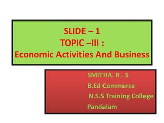 This document discusses economic and non-economic activities. It defines economic activities as those undertaken to earn money through the production and distribution of goods and services. Non-economic activities are done without intention of profit, for personal pleasure or satisfaction like religious and social services. While distinguishing the two can be difficult, economic activities generally aim to make money, create income/wealth, and use scarce resources, while non-economic activities satisfy social/emotional needs without expectation of income. The document also lists the main types of economic activities as profession, employment, and business.