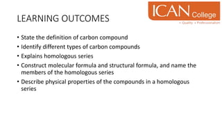 This document provides information about carbon compounds. It begins by defining carbon compounds as compounds that contain carbon as a constituent element. It then discusses why carbon is unique in its ability to form four covalent bonds and long chains of carbon atoms. The document separates carbon compounds into organic and inorganic compounds. It focuses on organic compounds, especially hydrocarbons. It discusses saturated and unsaturated hydrocarbons, including alkanes, alkenes, and alkynes. The document explains how to name compounds in each homologous series and describes some of their physical and chemical properties.