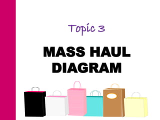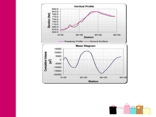 The document discusses mass haul diagrams (MHD), which are used to compare earthwork distribution costs for construction projects. MHDs graphically represent cumulative earthwork volumes along a linear profile. Peaks indicate transitions between cuts and fills, and balanced sections are bounded by points intersecting the x-axis. MHDs can identify where cuts and fills balance, quantities of material movement, and if borrow or waste is required. Construction of MHDs involves plotting cumulative earthwork values along the y-axis by stationing along the x-axis. Analysis of MHDs determines balanced sections and their average haul distances to estimate transportation costs.