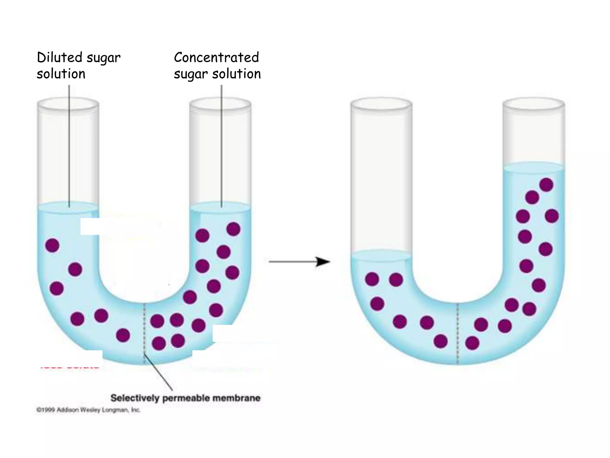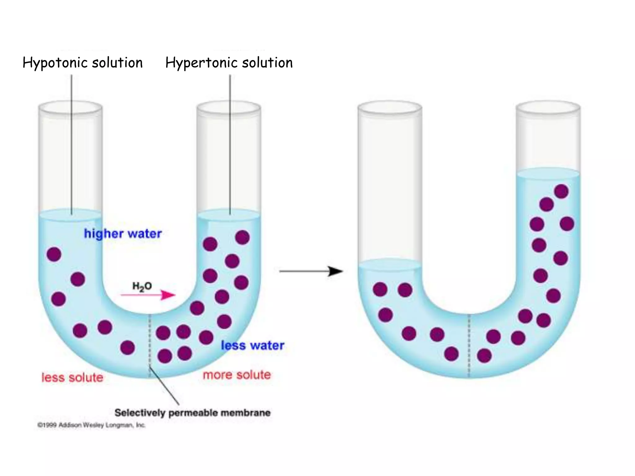 This document summarizes osmosis and the effects of hypertonic, hypotonic, and isotonic solutions on plant and animal cells. It explains that in a hypertonic solution, water diffuses out of the cell, while in a hypotonic solution water diffuses into the cell. An isotonic solution does not change the cell volume as water diffuses in both directions at equal rates. It provides examples of how osmosis impacts wilting plants and food preservation.