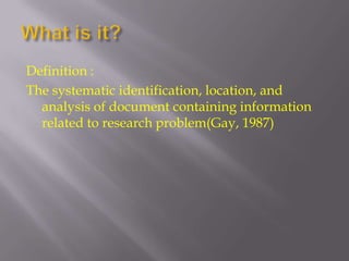 The review of related literature systematically identifies, locates, and analyzes documents containing information related to a research problem. It provides benefits such as obtaining ideas from other researchers and learning results from other studies. The purposes of reviewing related literature is to understand what has already been done in the field, provide a logical framework and foundational knowledge, and avoid replicating past research by profiting from other experiences and approaches.