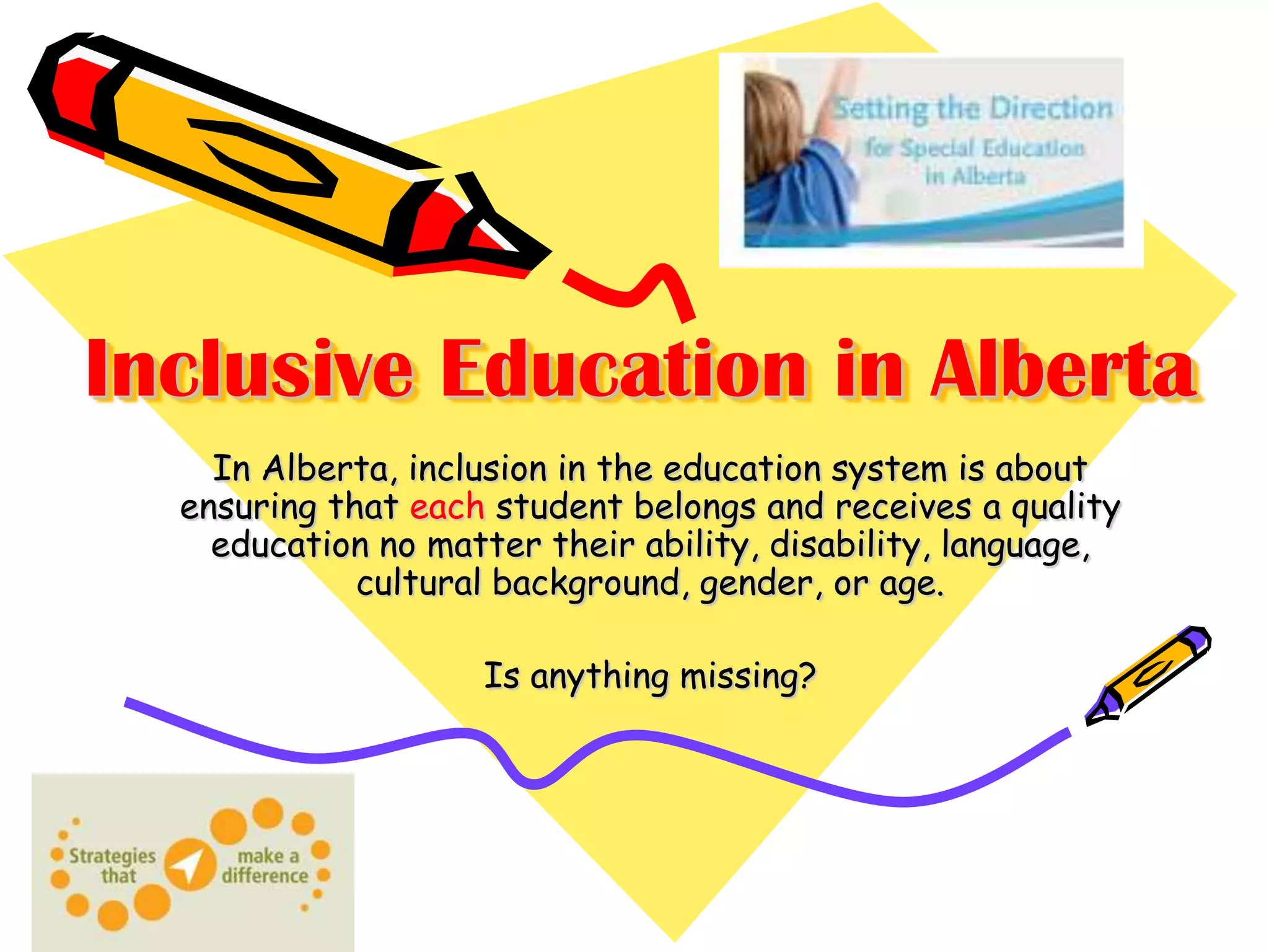 The document discusses inclusive education in Alberta. It states that inclusion in the education system means ensuring every student belongs and receives a quality education regardless of ability, disability, language, culture, gender, or age. It also lists some current issues in inclusive education such as students with severe needs, learning styles/problems, special needs students, ESL students, and gender issues. It asks how to build a positive learning environment that addresses these students' needs and ensures they feel a sense of belonging.