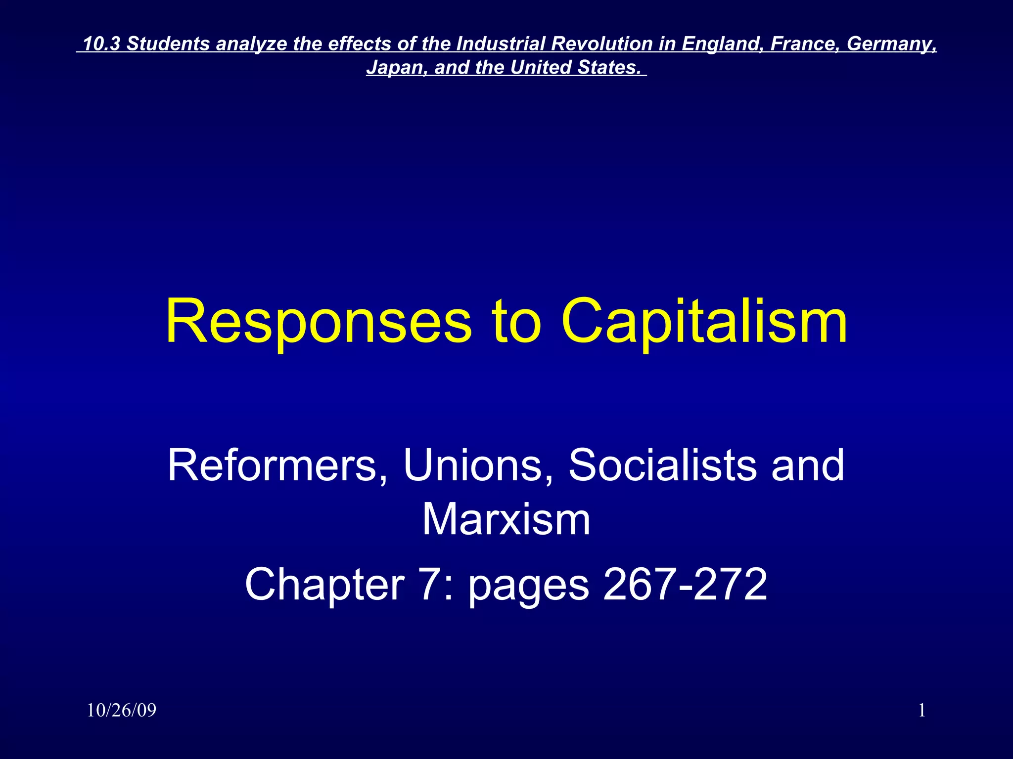 This document discusses responses to capitalism from reformers, unions, and socialists in the 19th century. It covers Robert Owen and Charles Fourier's utopian socialist ideas to address social problems through cooperative communities. Workers organized unions to advocate for better conditions and pay. Reform laws aimed to limit child labor and work hours. Karl Marx critiqued earlier socialists as utopian dreamers and proposed scientific socialism, arguing that capitalism would inevitably lead to conflict between the bourgeoisie and proletariat classes.