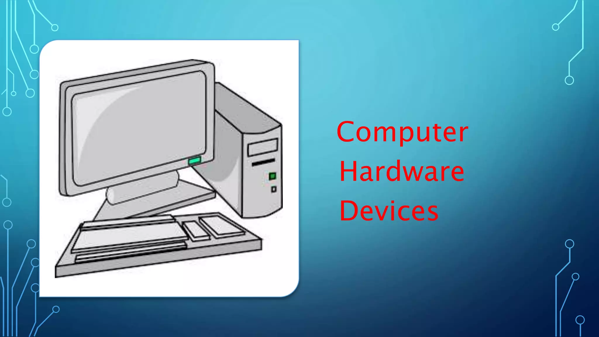 This document provides an overview of computer hardware components. It discusses the major components which include input devices like keyboards, mice, and scanners; processing devices like the CPU and motherboard; storage devices like hard drives, SSDs, and flash drives; and output devices like monitors, speakers, and printers. For each component type, examples are given and some components like mice, keyboards, and printers are described in more detail. The document aims to explain the basic hardware that makes up a computer system.