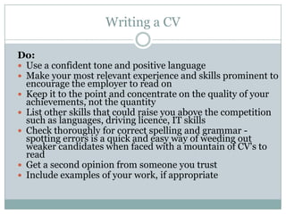 The document provides guidance on dos and don'ts for job applications. It advises applicants to use a confident, positive tone in their resumes and cover letters and to highlight their relevant skills and experiences. Applicants should avoid gaps in their work history, lying about details, or including irrelevant information. The document also cautions against generalizations, waffling, hype, underselling, and flowery language in cover letters. Proper etiquette and preparation are emphasized for job interviews.