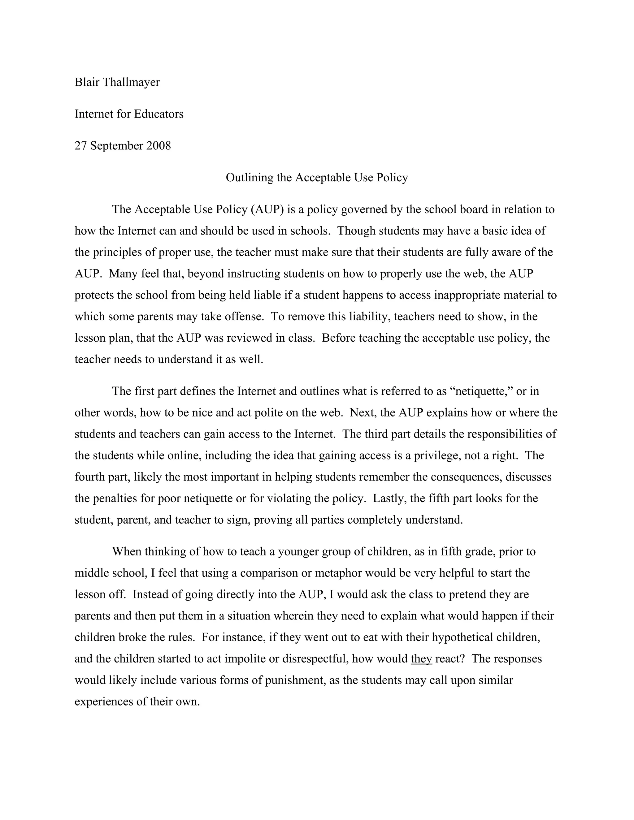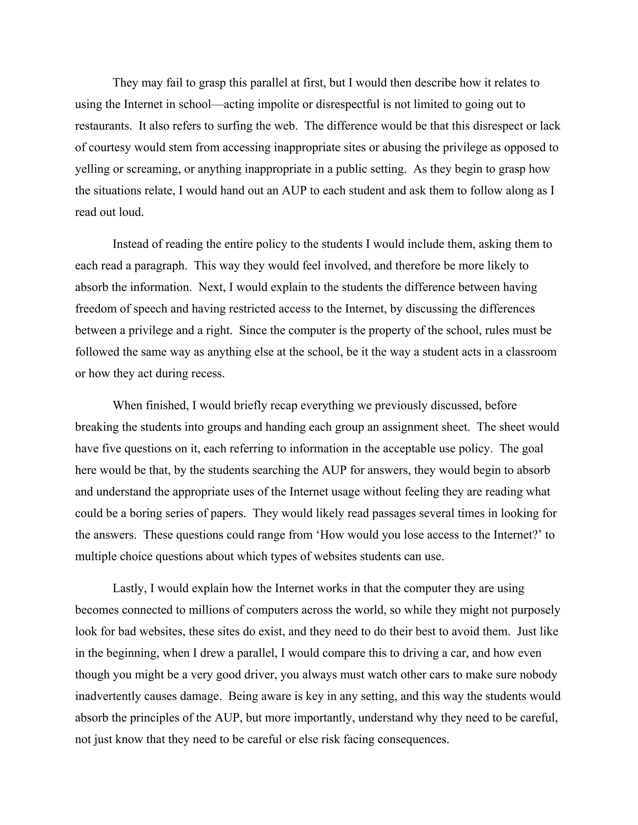 The document outlines a plan for teaching 5th grade students about the Acceptable Use Policy (AUP) for using the internet in school. The teacher would start by drawing a parallel between following rules at home and following the AUP. Students would then read and discuss the AUP in groups. The lesson aims to ensure students understand the AUP and why certain restrictions are in place, rather than just knowing the rules.