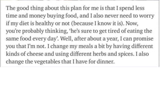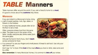 The document outlines a lesson plan for a speaking and listening class about food and drink. It includes various activities like playing food-related games, discussing food preferences, listening to conversations about restaurant meals, role playing ordering food at a cafe, and practicing grammar related to quantities. It allocates time periods for each activity and provides instructions and materials to support completing the tasks.