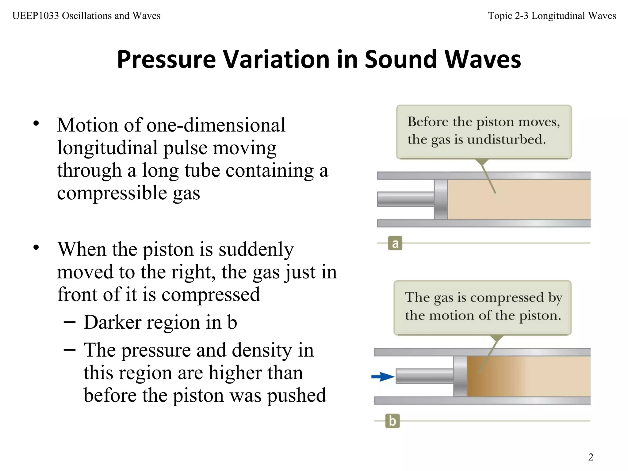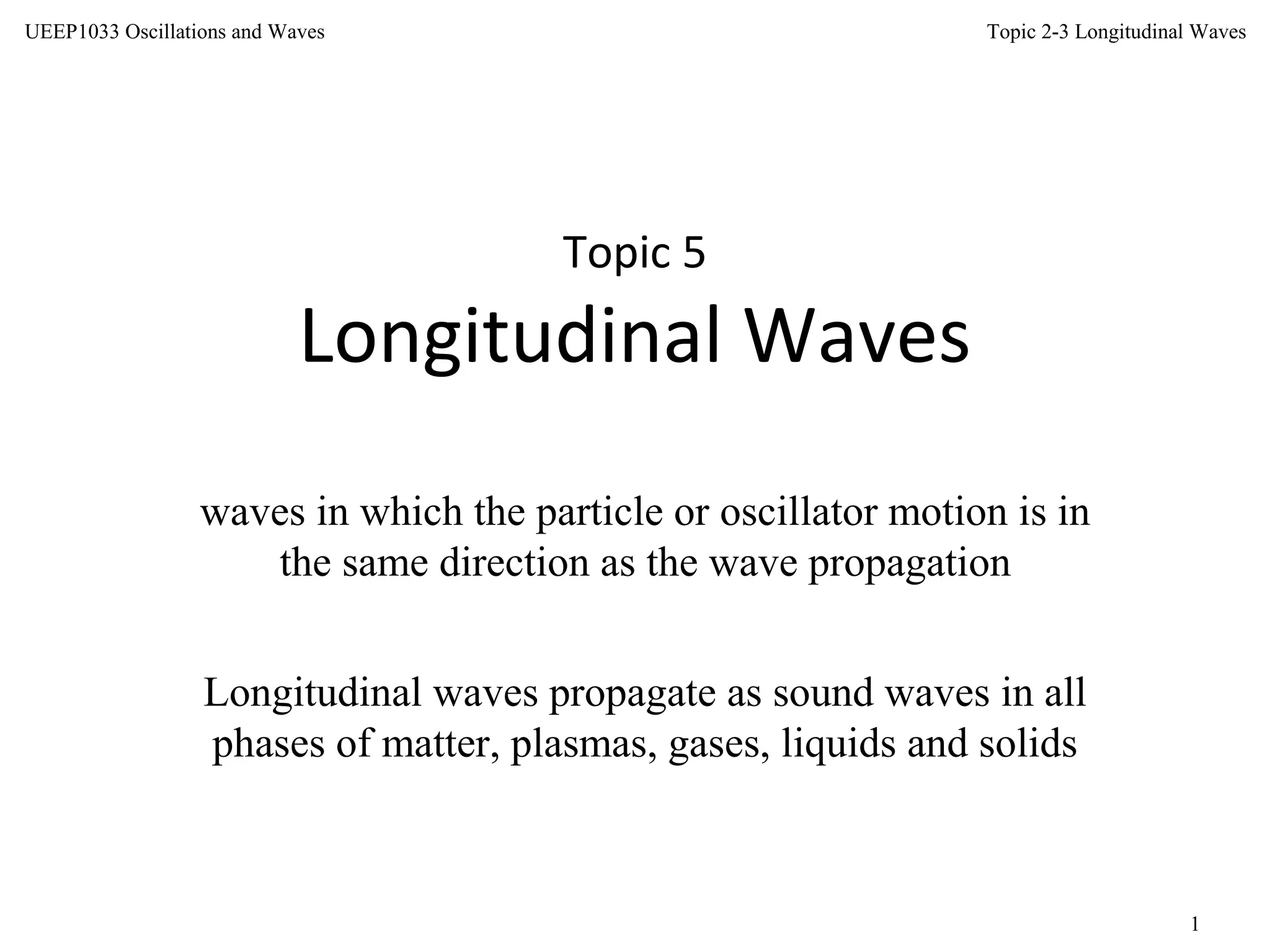 This document discusses longitudinal waves, in which particle motion is parallel to the direction of wave propagation. Longitudinal waves include sound waves, which can propagate through gases, liquids, and solids. The document describes how a periodic longitudinal wave can be produced by a piston moving with simple harmonic motion, causing variations in pressure and density. It defines key characteristics of longitudinal waves like displacement, pressure variation, wavelength, frequency, speed and relates these to properties of the medium like bulk modulus and density. The speed of sound, power, intensity, and the inverse square law for intensity from a point source are also covered.