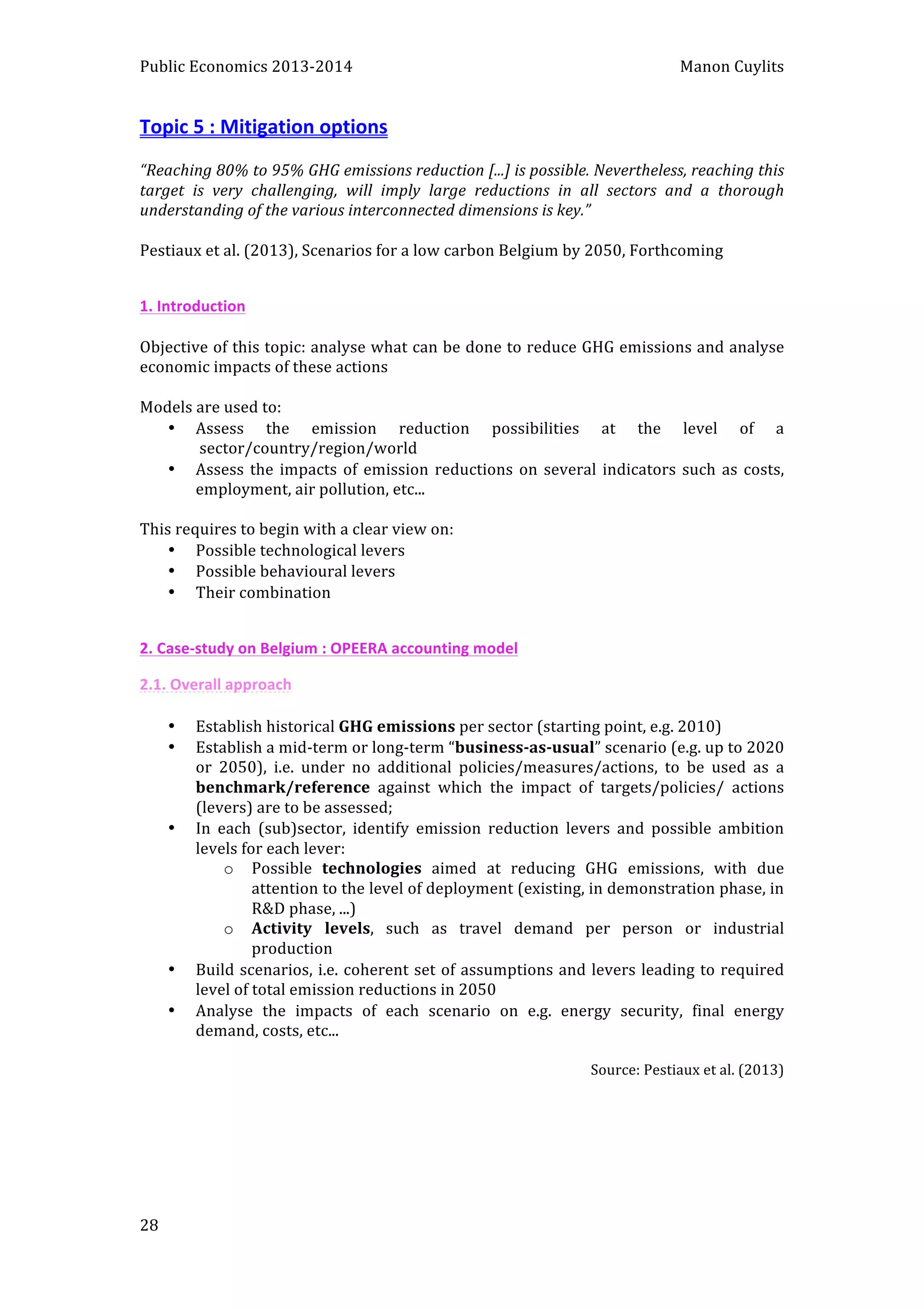 This document describes the use of modeling to analyze options for reducing greenhouse gas (GHG) emissions and their economic impacts. It discusses an accounting model called OPE2RA that was used to study scenarios for reducing Belgium's GHG emissions by 80-95% by 2050 compared to 1990 levels. The model establishes historical emissions by sector, builds baseline and mitigation scenarios by identifying reduction opportunities in sectors like transport, buildings, agriculture, industry and energy production, and analyzes scenario impacts on emissions, costs, energy use and other indicators.