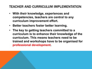 Teachers play a central role in curriculum implementation. There are two perspectives on how teachers should implement curriculum - fidelity and mutual adaptation. The fidelity perspective believes teachers should closely follow the written curriculum, while the mutual adaptation perspective believes teachers should creatively adapt curriculum to meet student needs. Factors like teachers' beliefs, knowledge, resources and support can influence how successfully they implement curriculum.