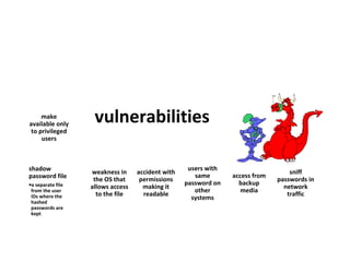 The document discusses various methods for user authentication, including passwords, tokens, and biometrics. It describes strategies for improving password security, such as password selection techniques, password files, and shadow passwords. It also covers token-based authentication using memory cards and smart cards. Biometric authentication using physical characteristics like fingerprints is explored. Finally, it summarizes challenges with remote user authentication and provides examples of password, token, and biometric protocols.
