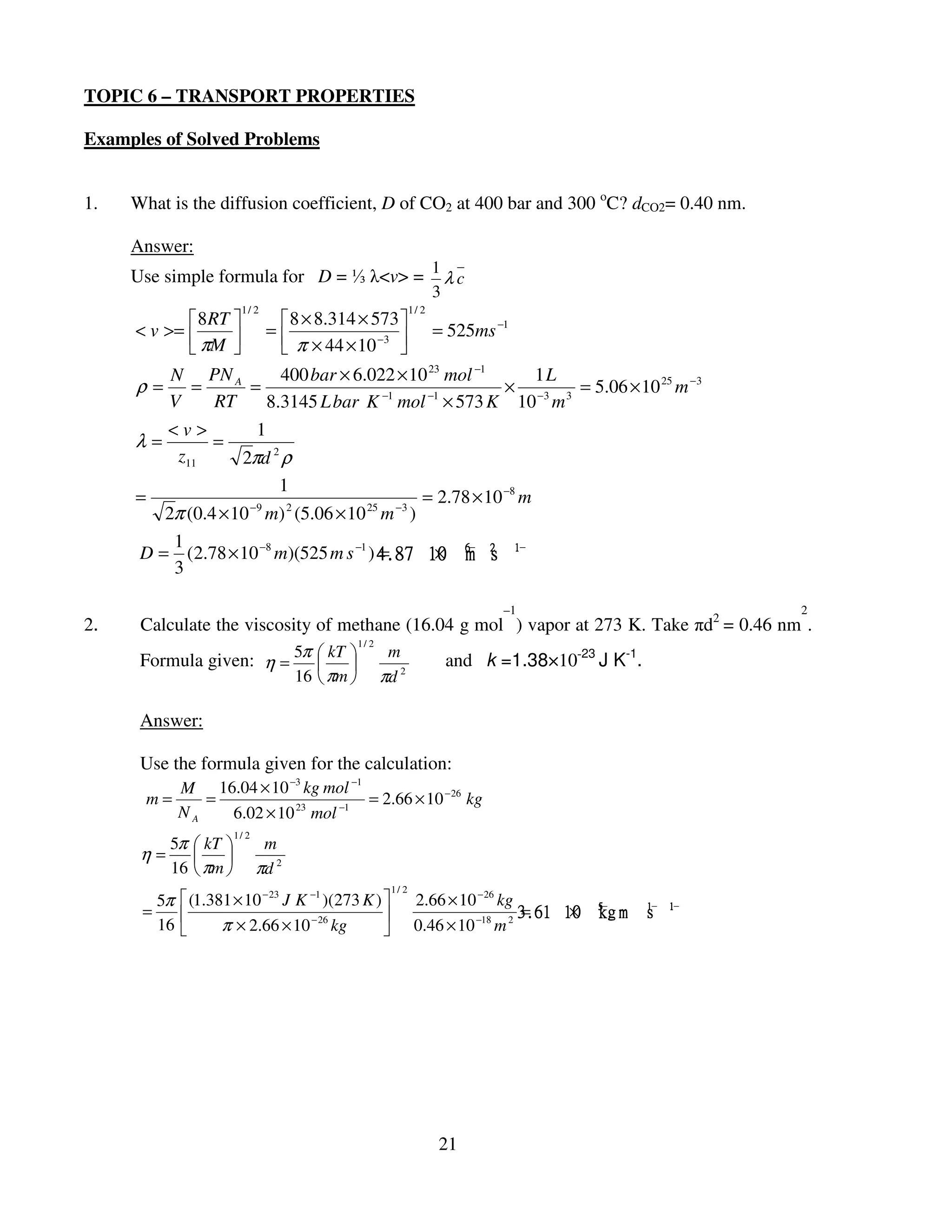 1. It gives examples calculating the diffusion coefficient of CO2 and viscosity of methane using transport property formulas.