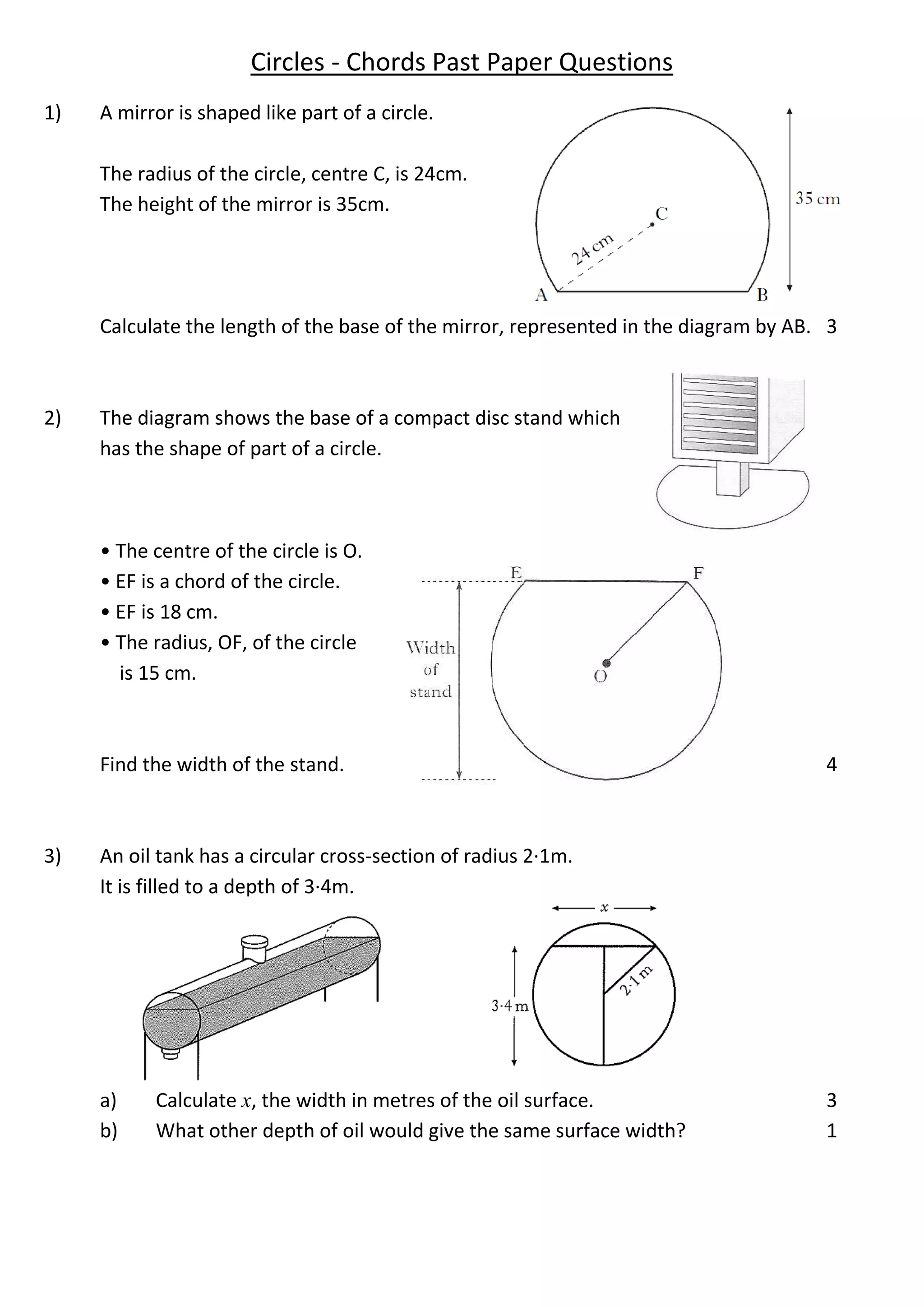 This document contains 12 math word problems involving circles, chords, radii, diameters, and calculating lengths, widths, heights, depths, and distances using properties of circles. The problems involve shapes of mirrors, disc stands, oil tanks, doorways, tunnels, logos, saw blades, and water pipes. Calculations require using the definitions of radius, diameter, chord, arc, and relationships between these parts of a circle.