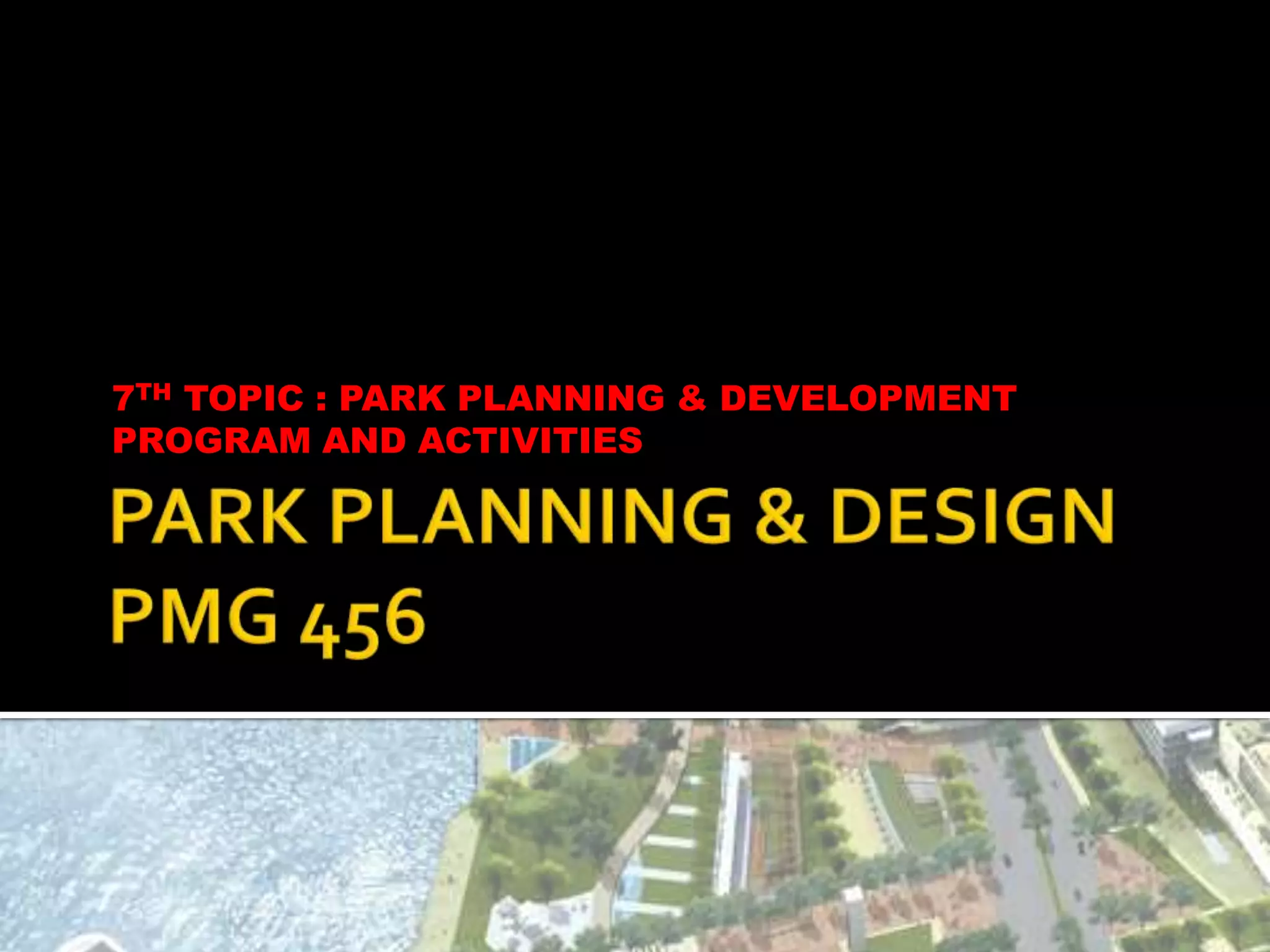 The document outlines the four major phases of park planning - pre-design, design, development, and actualization - and describes the steps and objectives involved in properly planning park activities, facilities, and visitor experiences at each stage. These include determining suitable activities, analyzing user needs, developing concept plans, and ensuring coordination across physical, programmatic, and human factors to provide quality recreational opportunities. Park planning is presented as an ongoing and iterative process aimed at creating and continually improving park experiences.