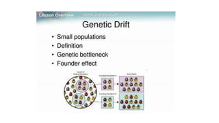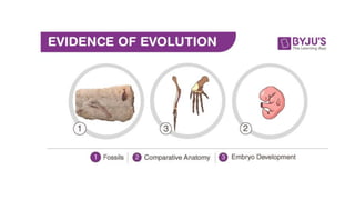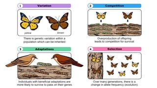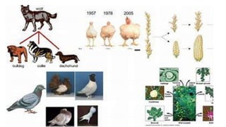 The document discusses concepts of evolution, specifically artificial selection and natural selection. It explains that artificial selection involves humans breeding organisms for desired traits, while natural selection is a process through which populations adapt over time, leading to speciation. Additionally, it covers genetic drift, mutation, recombination, fossil evidence, comparative anatomy, and taxonomy, highlighting the importance of these mechanisms in understanding evolutionary processes.