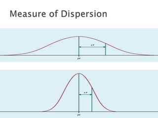 This document discusses various statistical measures used to summarize and describe data, including measures of central tendency (mean, median, mode) and measures of dispersion (range, variance, standard deviation). It provides definitions and examples of calculating each measure. Standardized scores like z-scores and t-scores are also introduced as ways to compare performance across different tests or distributions. Exercises are included for readers to practice calculating and interpreting these common descriptive statistics.