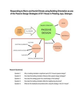This document proposes a case study on the S11 House in Petaling Jaya, Selangor, Malaysia. It will focus on how the building's orientation is a significant part of its passive design strategies for the warm, humid climate. The building orientation influences other passive techniques and governs the overall design. It will also examine how orientation affects neighboring structures and potential drawbacks. The S11 House was designed by a local architect to be energy efficient through clever passive design and materials. Its orientation prevents unnecessary heat gain and sunlight exposure while taking advantage of cool winds, while keeping the design contextual to the traditional surrounding buildings.