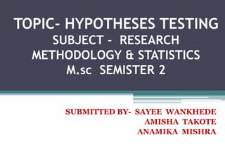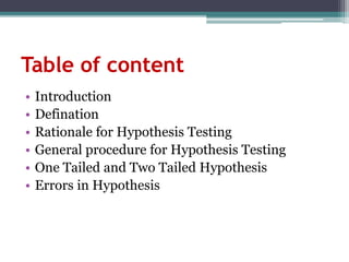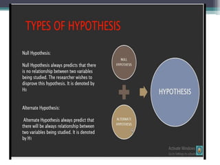 This document provides an overview of hypotheses testing in research. It defines a hypothesis as an explanation or proposition that can be tested scientifically. The main points covered are: