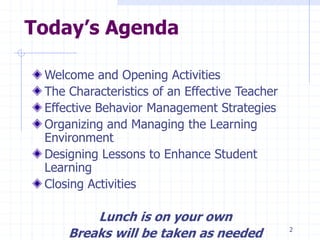 The document discusses effective classroom management strategies. It begins by outlining the goals and objectives of the presentation, which include identifying characteristics of effective teachers, understanding why students misbehave and effective behavior management strategies, organizing effective learning environments, and identifying resources for classroom management. The presentation techniques utilized will include discussion, activities, self-reflection, and active learning strategies. The document then discusses characteristics of well-managed classrooms, effective classroom schedules, preparing the physical space and student work areas, using attention signals, and the difference between discipline and punishment.