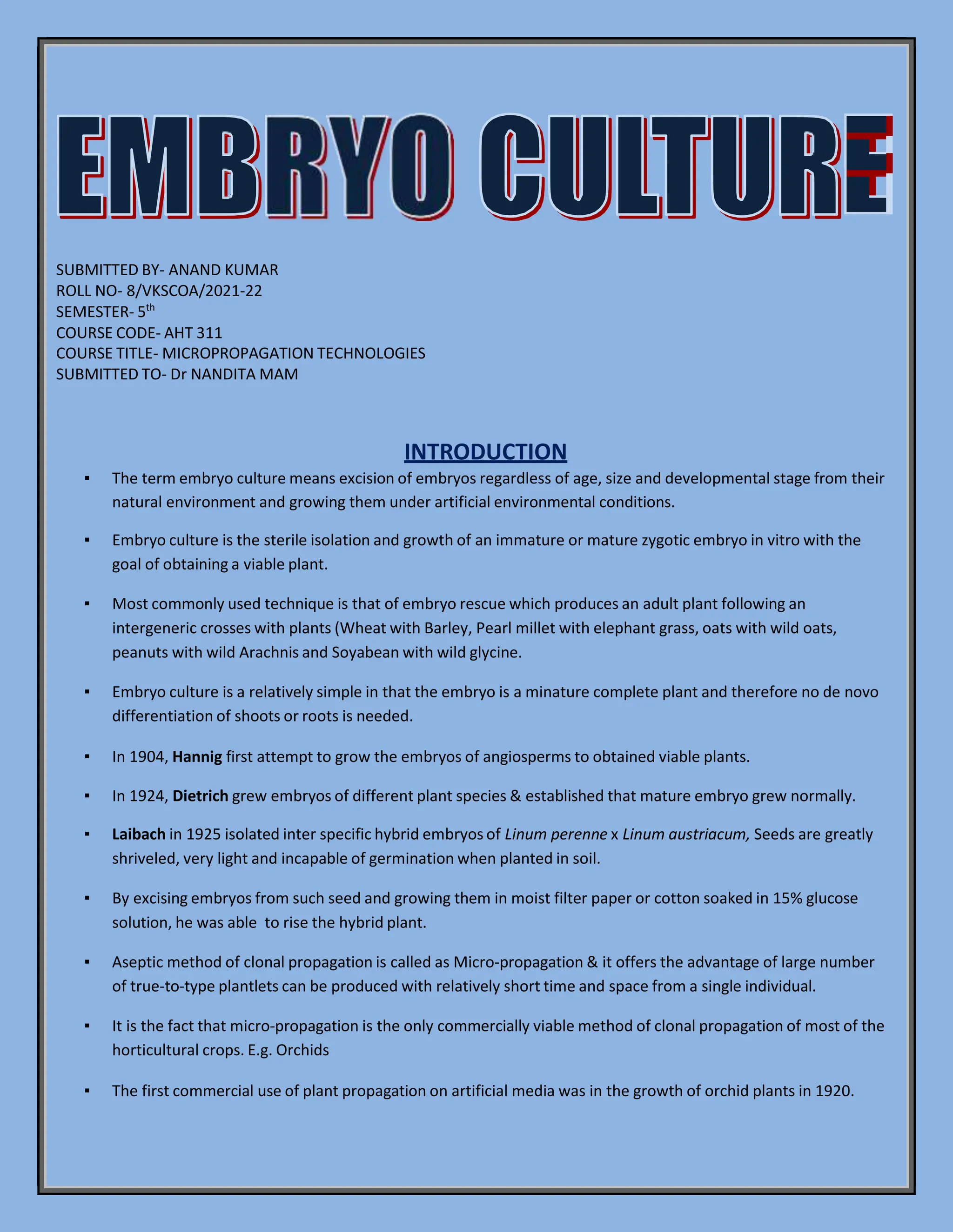 This document discusses embryo culture techniques. It begins by defining embryo culture as the sterile isolation and growth of immature or mature zygotic embryos in vitro to obtain viable plants. Embryo culture is commonly used for embryo rescue in intergeneric plant crosses. The document then discusses types of embryo culture including mature and immature embryo culture. It provides details on excising embryos and the cultural requirements for embryo growth, such as suitable media, carbohydrates, amino acids, and growth regulators. Finally, the document outlines several applications of embryo culture including producing rare hybrids, developing disease resistance, propagation of rare plants, and shortening breeding cycles.