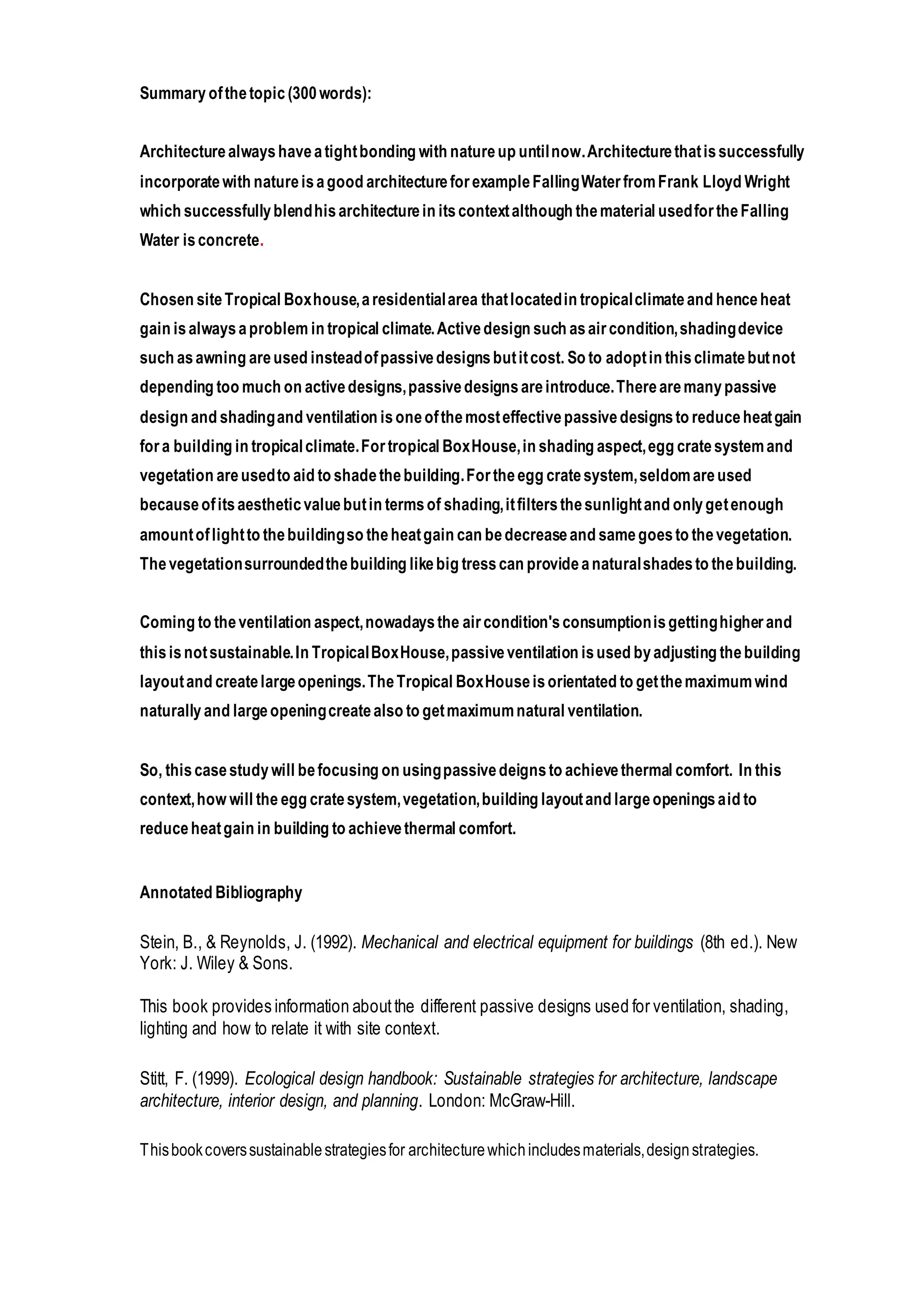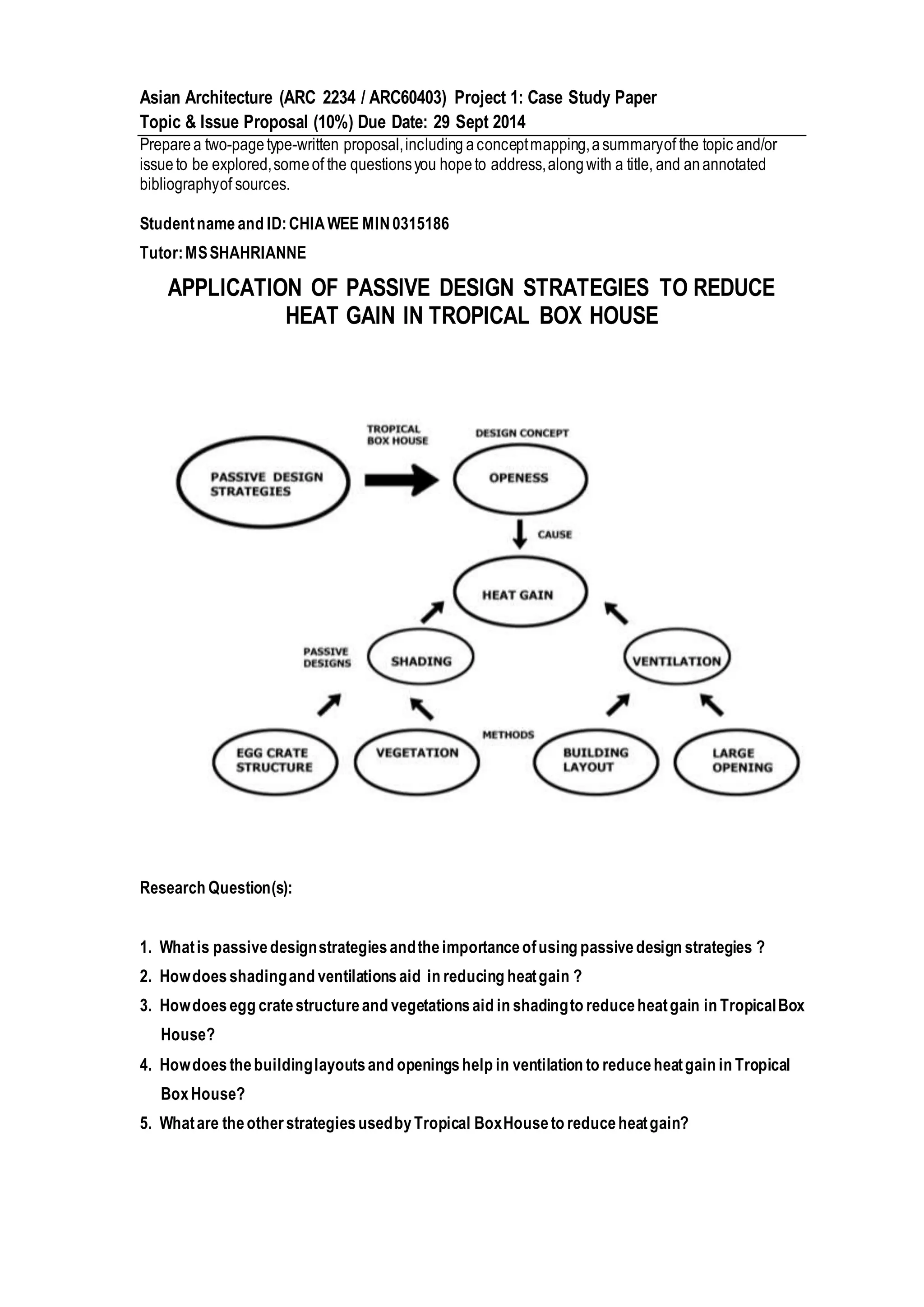 This document is a project proposal for a case study on applying passive design strategies to reduce heat gain in tropical box houses. The student proposes to study how egg crate structures, vegetation, building layout and openings can aid in passive shading and ventilation. Specifically, the egg crate structure and surrounding vegetation provide natural shading. Meanwhile, orienting the building along a northeast-southwest axis and including large openings maximizes cross ventilation to reduce heat gain without active cooling systems. The student will analyze how these passive strategies help achieve thermal comfort in tropical climates.