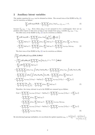 The document discusses Poisson factorization for topic modeling, introducing auxiliary latent variables and providing update equations for the model parameters. It employs variational Bayesian inference to derive the evidence lower bound (ELBO) and outlines the update procedures for the model's topics, including distributions for latent variables. Additionally, it references work on related models and provides detailed mathematical formulations for the inference process.