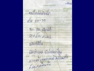 Topic palliative care ณัฐวุธ 13 ก.ค. 54 1. 2. 3. Palliative Care To preserve a person’s dignity and quality of life in the face of incurable illness. (Pratt & Wood, 1998: 12) 4. WHO: Palliative Care The a ctive total care of patients whose disease is not responsive to curative treatment. 5. คำจำกัดความของการดูแลผู้ป่วยแบบประคับประคอง โดย WHO “ การดูแลเพื่อทำให้ผู้ป่วยและครอบครัวที่กำลังเผชิญหน้ากับความเจ็บป่วยที่คุกคามชีวิตมีคุณภาพชีวิตที่ดีขึ้น ผ่าน กระบวนการป้องกัน และ บรรเทา ความทุกข์ทรมานด้วยการค้นหา ประเมินและให้การรักษาภาวะเจ็บปวดของผู้ป่วย รวมไปถึงปัญหาด้านอื่นๆทั้งด้านร่างกาย จิตใจ สังคม และ จิตวิญญาณ ตั้งแต่เริ่มต้น ” 6. Palliative Care A ctive total care (comfort) Holistic care Quality of life Inter profession 7. 8. 9. 10. สิ่งที่ต้องประเมิน เพื่อการดูแลผู้ป่วยระยะสุดท้าย ความเข้าใจของผู้ป่วยต่อ “โรค” ที่เป็น ความเข้าใจของ ครอบครัว ต่อโรคที่ผู้ป่วยเป็น ระยะของโรค อาการที่ผู้ป่วยเป็น ความทุกข์ทรมานของผู้ป่วย และการเยียวยาอาการเหล่านั้น สิ่งที่ปรารถนาที่จะทำ แต่ยังไม่ได้ทำ (unfinished business) ภาระที่ครอบครัวเผชิญ / ความลำบากของผู้ดูแล การวางแผนล่วงหน้า : สถานที่ตาย , ผู้ดูแล , พินัยกรรมชีวิต , การดูแลแบบประคับประคองที่บ้าน 11. 12. Kubler-Ross’s Stages of Dying Stage V :Acceptance “ My time is very close now, and it’s alright” Stage I :Shock & Denial “No, not me” Stage II : Anger “ Why me?” Stage III : Bargaining “Yes me, but..” Stage IV: Depression “Yes, me” 13. Breaking bad news: SPIKES model Setting - สถานที่ สภาพแวดล้อม ความเป็นส่วนตัว Perception – ค้นหาว่า ผู้ป่วยมีความรู้เกี่ยวกับโรคว่าอย่างไรบ้าง Invitation – เกริ่นนำ เพื่อให้ผู้ป่วยเตรียมตัว Knowledge - มีความรู้เกี่ยวกับโรคที่ผู้ป่วยเป็น Empathy – แสดงความเห็นใจผู้ป่วย Summary – สรุปสิ่งที่พูดคุย 14. Terminal Care End-of-life Care Hospice Care Palliative Care Compassionate Care 15. Hospice: Hospitality ที่พักสำหรับผู้เดินทางหรือนักแสวงบุญ Hospice แห่งแรกก่อตั้งโดยชาว Irish เมื่อปี 1879 ณ เมือง Dublin 16. Hospice = Hospitality Hospice refers to a program of care that supports the patient and family through the dying process and bereavement. 17. Hospice Care 80 % เป็นบริการที่บ้าน (Home Care) และบ้านพักคนชรา (Nursing Home) 18. E nd-of- L ife Care: Caring at the final weeks of life when death is imminent. 19. 20. ความหมายของ “ ผู้ป่วยระยะสุดท้าย ” “ ระยะซึ่งภูมิต้านทานของร่างกายและอวัยวะสำคัญบางส่วนของร่างกายถูกทำลายไปมากแล้ว การรักษาไม่ได้ผลอีกต่อไป ” สำนักงานปลัดสำนักนายกรัฐมนตรี “ เวลาที่บุคลากรทางการแพทย์ที่ดูแลผู้ป่วยอยู่จะไม่แปลกใจ หากผู้ป่วยเสียชีวิตภายใน 6 เดือน ” American Psychological Association 21. 22. วัฒนธรรมให้ความหมายการตายแตกต่างกัน ขงจื้อ - ความตายตอกย้ำคุณธรรม เต๋า - การกลับสู่ธรรมชาติ ความเป็นสามัญ คริสต์ - การพิพากษาและการไปหาพระเจ้า อิสลาม - การคืนกลับไปสู่พระเจ้า ผี พราหมณ์ - การไปสู่ภพหน้า พรหมโลก พุทธ - อนิจจัง กรรม การเวียนว่าย 23. 24. 25. 26. ตระหนักในตนเอง / ถามตัวเอง เมื่อเวลานั้นมาถึง ... - คิดและรู้สึกอย่างไร - เวลาที่เหลือจะทำอะไร - ปรารถนาจะให้ใครทำ