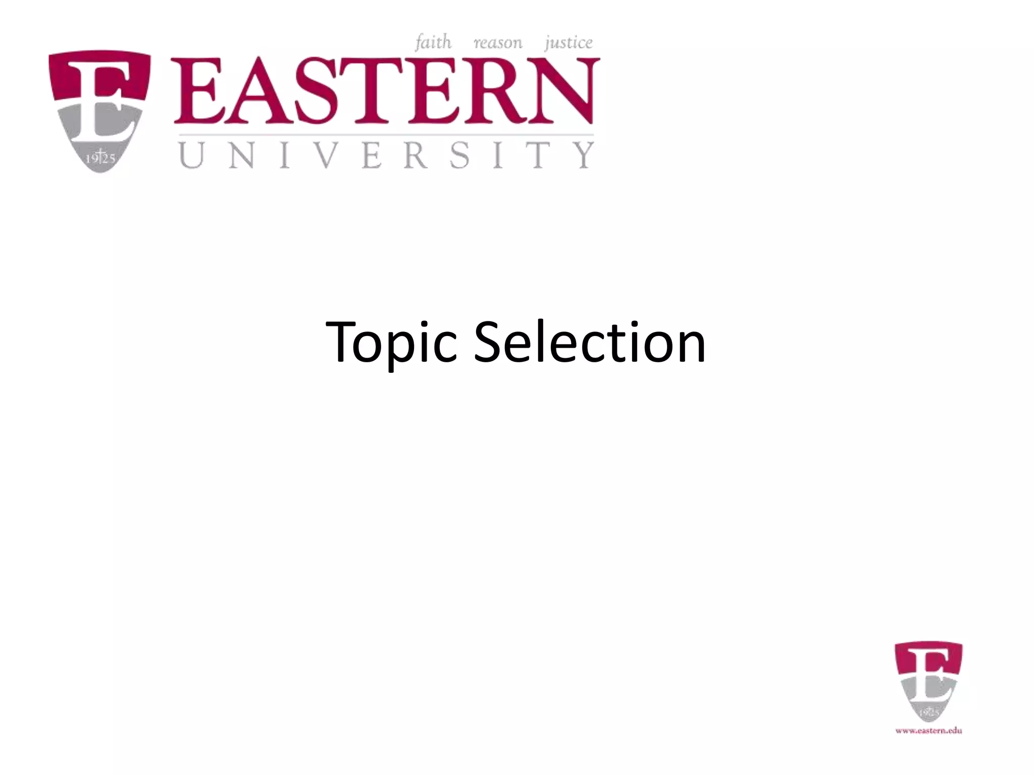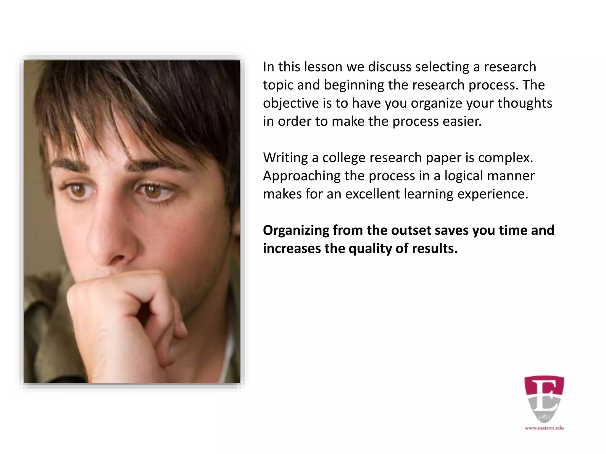 This document discusses selecting a research topic and organizing the research process. It emphasizes focusing the topic narrowly, ensuring adequate time and resources are available, and framing the topic as a series of questions. The objective is to have students thoughtfully select a topic they are interested in and can adequately research within the constraints of the assignment. Students should discuss potential topics with their professor or librarian to identify appropriate resources and scope. Organizing the research from the outset through narrowing the topic, assessing time and resources, and questioning what they aim to learn will save students time and improve their results.