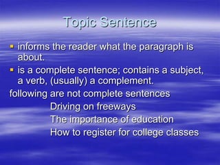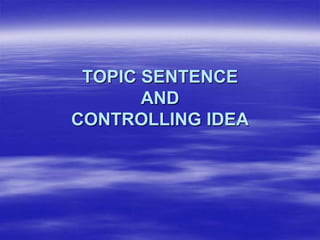 The document discusses topic sentences and controlling ideas. A topic sentence introduces the main idea of a paragraph and contains a subject and verb. A controlling idea provides specific details or parts to narrow the topic sentence. Together, a topic sentence and controlling idea give an overview of the paragraph's content in a general and specific statement.