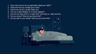 This document asks questions about a person's typical sleep habits including how many hours they sleep per night, what time they go to bed and wake up, whether they are a light or heavy sleeper, if they are a morning or night person, if they snore and how they know, and if they talk in their sleep and how they know.