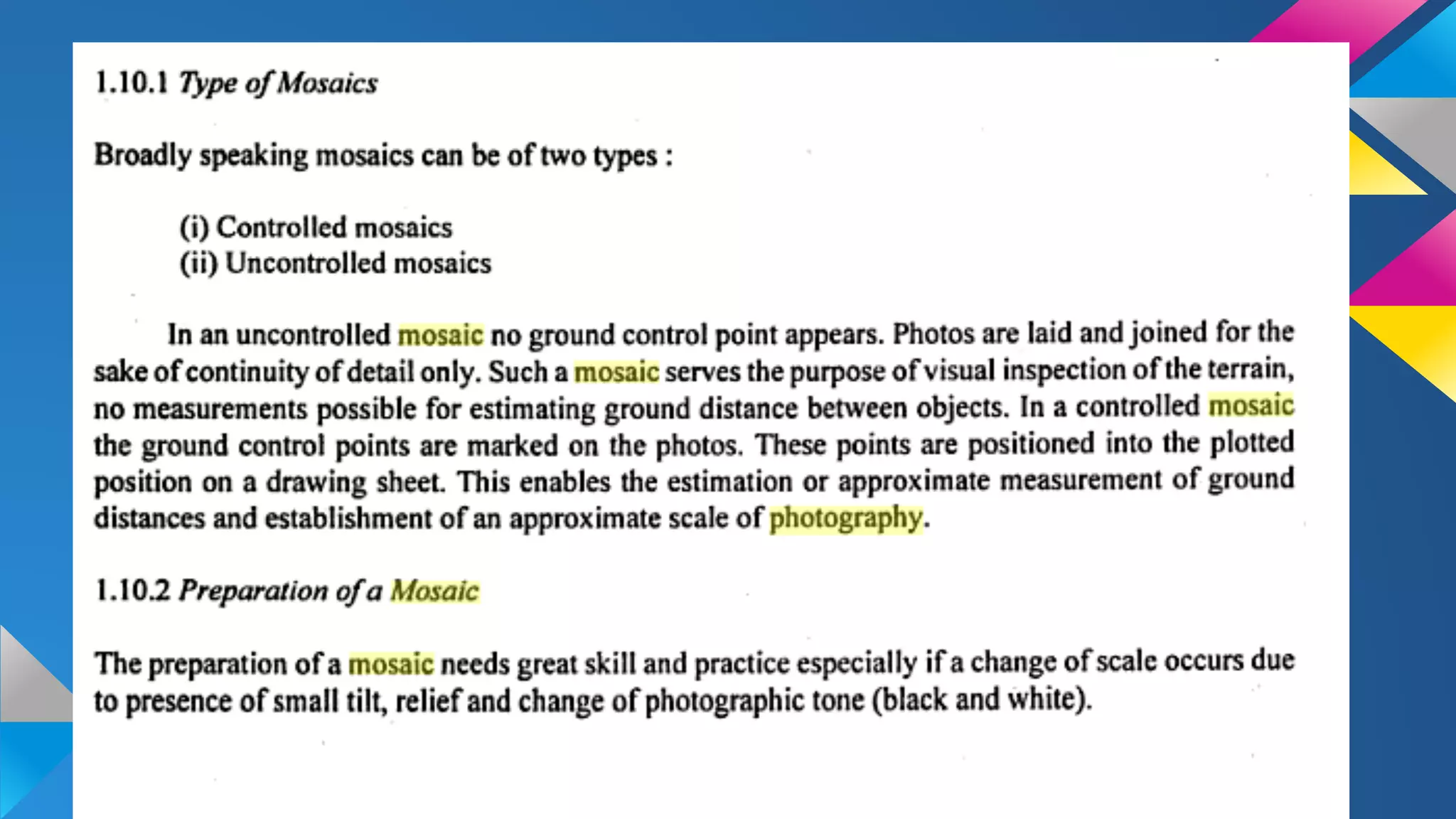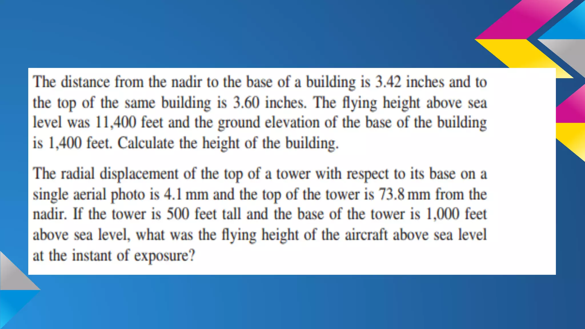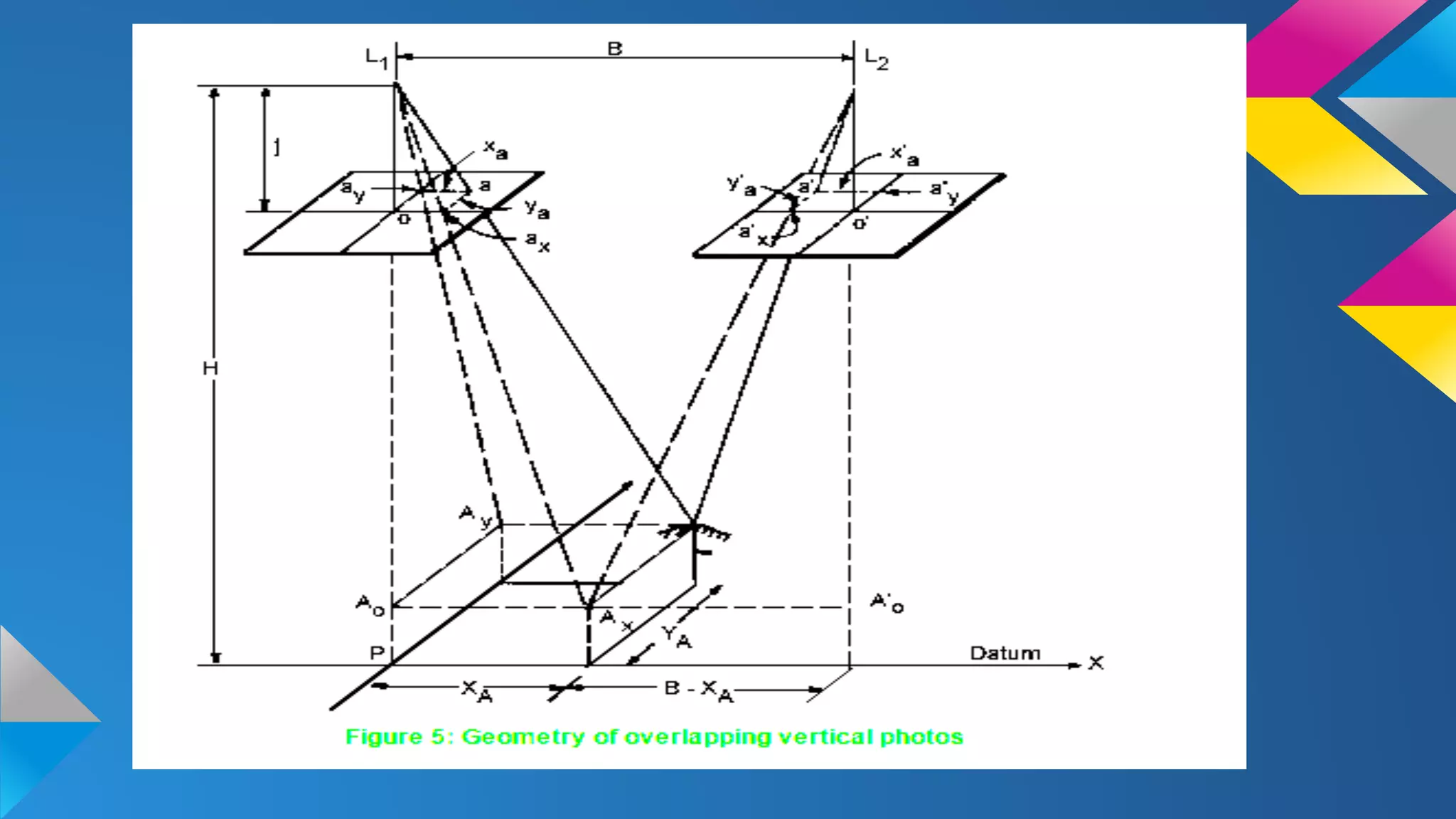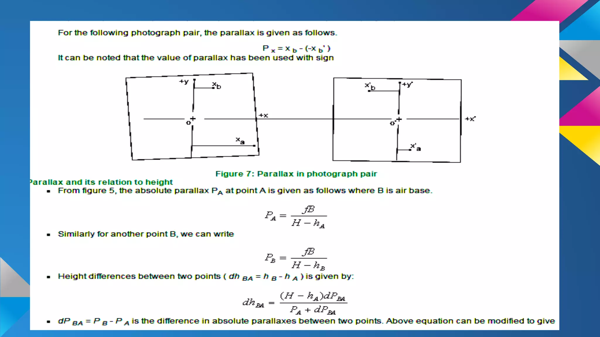 The document discusses stereoscopy, a technique for creating the illusion of depth in images through binocular vision. It explains the principles of stereoscopic vision, the necessary conditions for producing 3D effects, and the geometry of overlapping aerial photographs. It also addresses concepts such as absolute parallax, vertical exaggeration, and provides examples related to calculating elevations from parallax measurements.