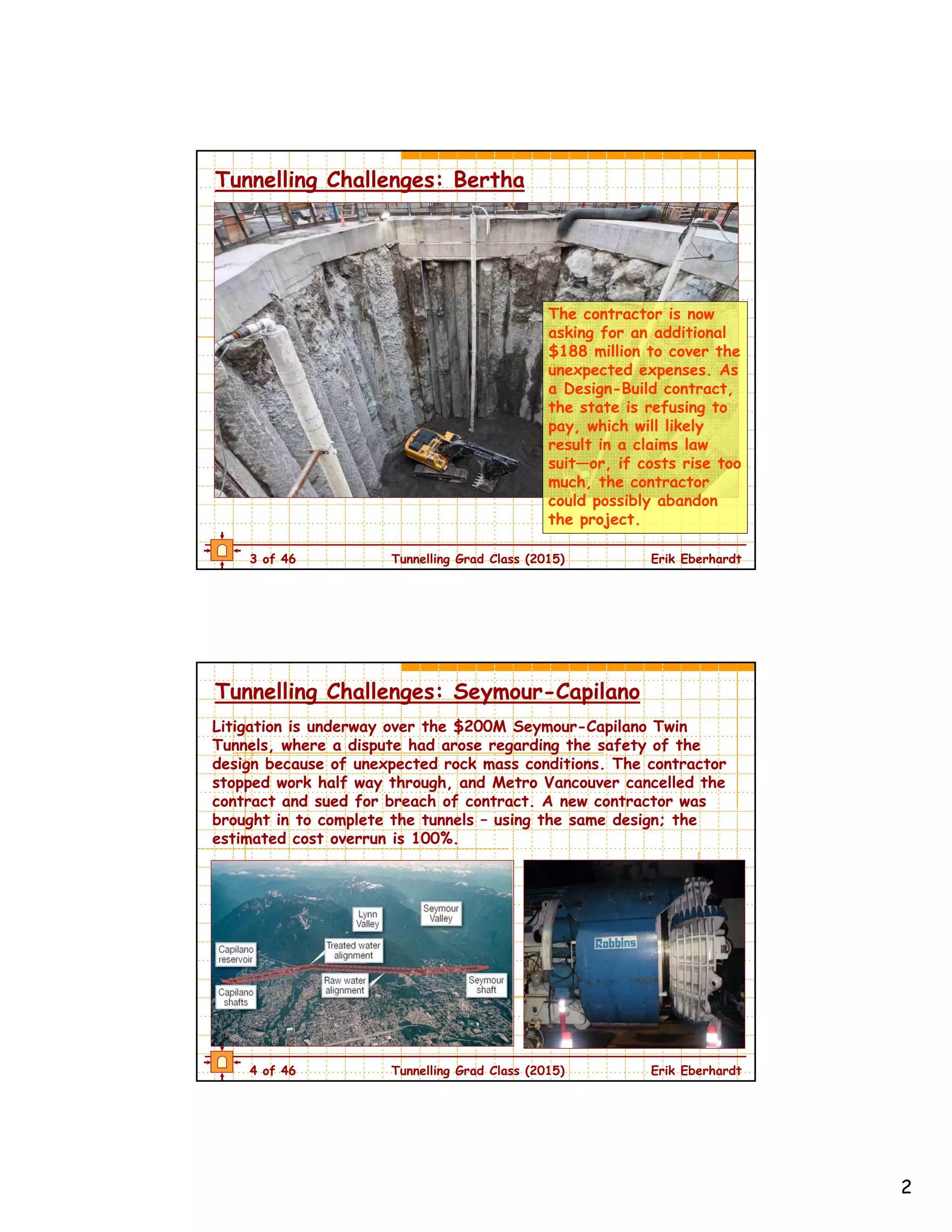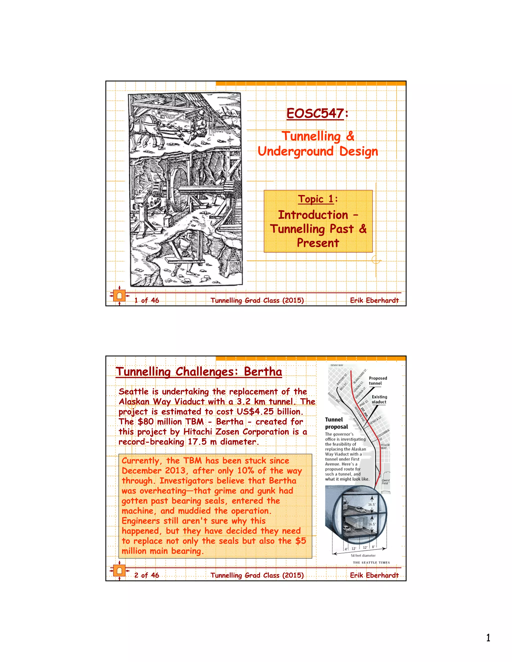 This document provides an overview of past and present tunnelling projects and challenges. It discusses the stuck Bertha tunnel boring machine in Seattle which has been stuck since 2013 due to overheating. It also discusses cost overruns and litigation on the Seymour-Capilano Twin Tunnels project in BC. Finally, it provides details on the course topics, lectures, and assignments for an introduction to tunnelling class.