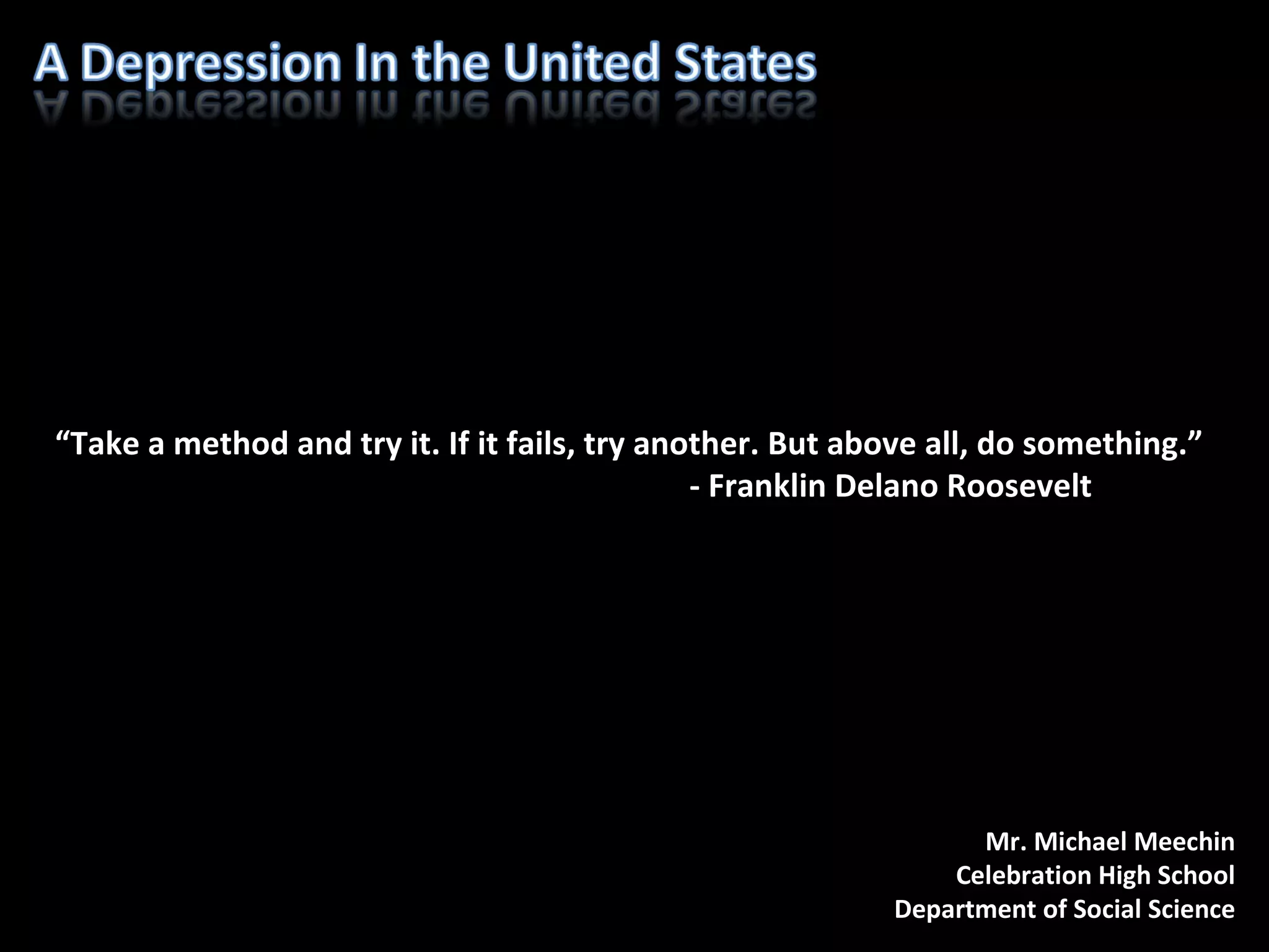 The document summarizes the economic conditions during the 1920s stock market boom and bust, and the Great Depression that followed. It describes how many Americans invested heavily in the stock market during the prosperous 1920s, often buying stocks on margin, but then panicked when the market crashed in 1929, wiping out their savings. The crash led to widespread unemployment, poverty, and homelessness as businesses closed and banks failed across the country in the early 1930s. President Roosevelt attempted to address the crisis through New Deal programs.