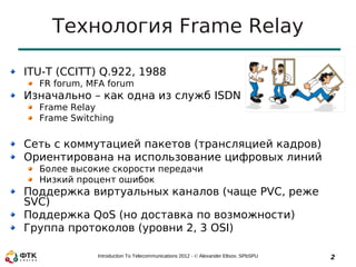 Документ посвящен технологии Frame Relay, которая используется в телекоммуникациях для доступа к глобальным сетям с высокими скоростями передачи данных и низким процентом ошибок. Он описывает основные функции, область применения и характеристики, включая поддержку виртуальных каналов и параметры качества обслуживания (QoS). Кроме того, рассматриваются ключевые аспекты протоколов и механизмов коммутируемой передачи данных.
