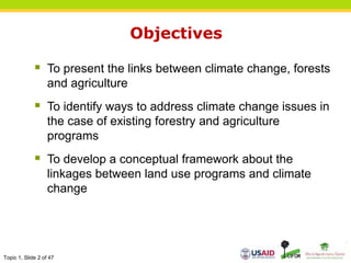 This document provides an overview of integrating climate change into forestry programs. It discusses how forests provide ecosystem services that help mitigate climate change through carbon storage and adaptation through services like water regulation. Specific topics covered include the role of forests in the carbon cycle and climate mitigation, how deforestation and forest growth impact carbon stocks and fluxes, examples of forest adaptation services, and international frameworks like the Kyoto Protocol's Clean Development Mechanism and later REDD+ programs that create payments for forest carbon storage. The goal is to identify how existing forestry programs can address climate change issues through both mitigation and adaptation approaches.