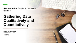 This document provides information about gathering data qualitatively and quantitatively. It begins by stating the expected learning outcomes, which are to define and differentiate qualitative and quantitative data, and classify examples by data type. It then explains that quantitative data involves measuring or counting, while qualitative data is gathered through interviews, surveys, and observations. Examples of collecting both types of data are also provided, such as using surveys to gather quantitative ratings or qualitative opinions. The document concludes with a quiz to test the understanding of differentiating qualitative and quantitative data and examples.